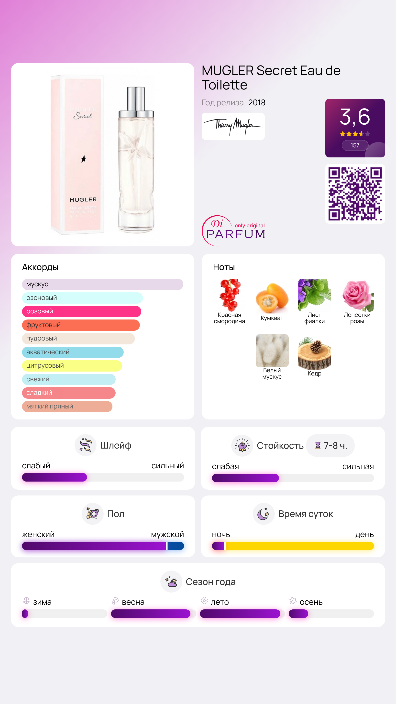 Нежное, почти эфемерное сердце аромата воспринимается настолько деликатно, что к нему хочется прикасаться с осторожностью — розовые лепестки, изящные и легкие, как будто танцуют в воздухе, оседая на бархатных листьях фиалки. Завершает композицию тонкая пастель — белый мускус в сочетании с цветочно-холодным кедром формируют шлейф аромата MUGLER Secret Eau de Toilette.
