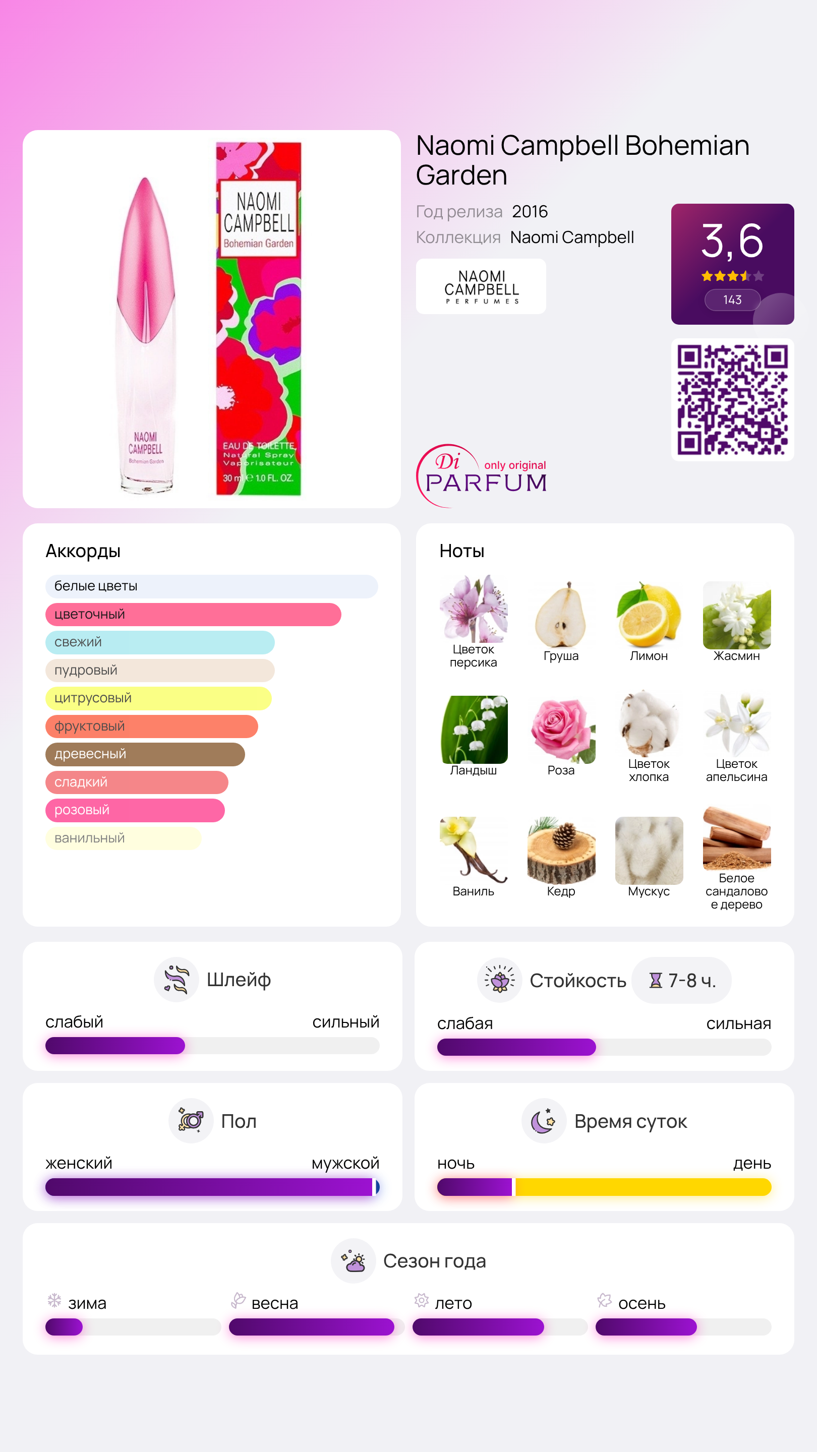 Весеннее настроение аромата ориентировано на уверенных в себе соблазнительниц, готовых завоевывать мужские сердца. Стильный флакон, выполненный в ярко-розовых тонах и оформленный красочными цветочными узорами, подчеркивает уникальность этого аромата.