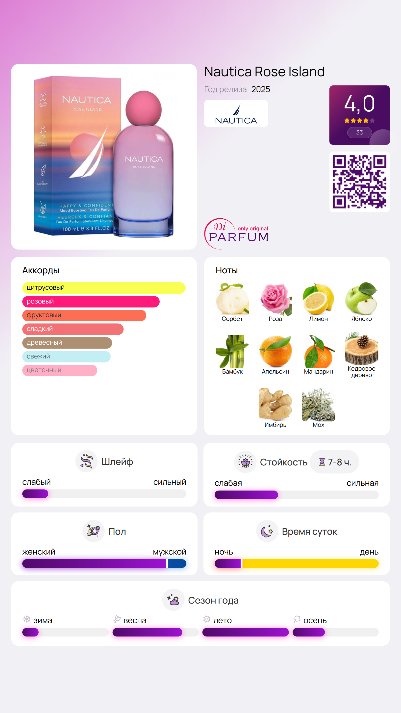 Rose Island от Nautica - это Citrus Aromatic парфюм для женщин, который великолепно сочетает в себе свежесть цитрусовых и цветочные акценты. Этот новый аромат был представлен в 2025 году и уже покорил сердца многих ценителей парфюмерии.