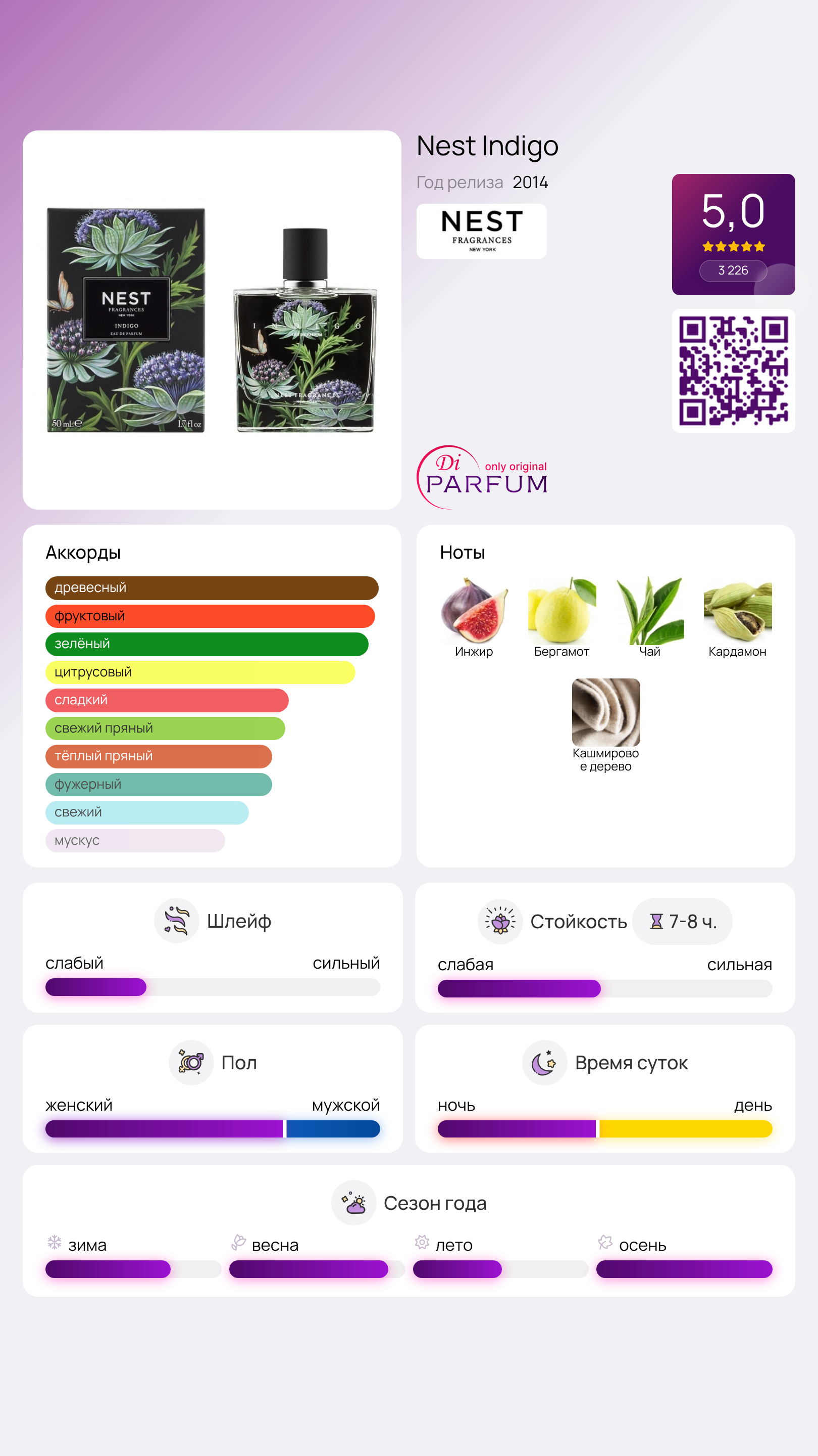 Создавая свои ароматы, Jerome Epinette черпал вдохновение у Мари Дейлани, жившей в 18 веке и прославившейся как "гений декупажа". Ее оригинальная методика создания картин с использованием папиросной бумаги проявилась на флаконе Nest Indigo, а стремление к естественности стало основой аромата, в формуле которого присутствуют только натуральные ингредиенты.
