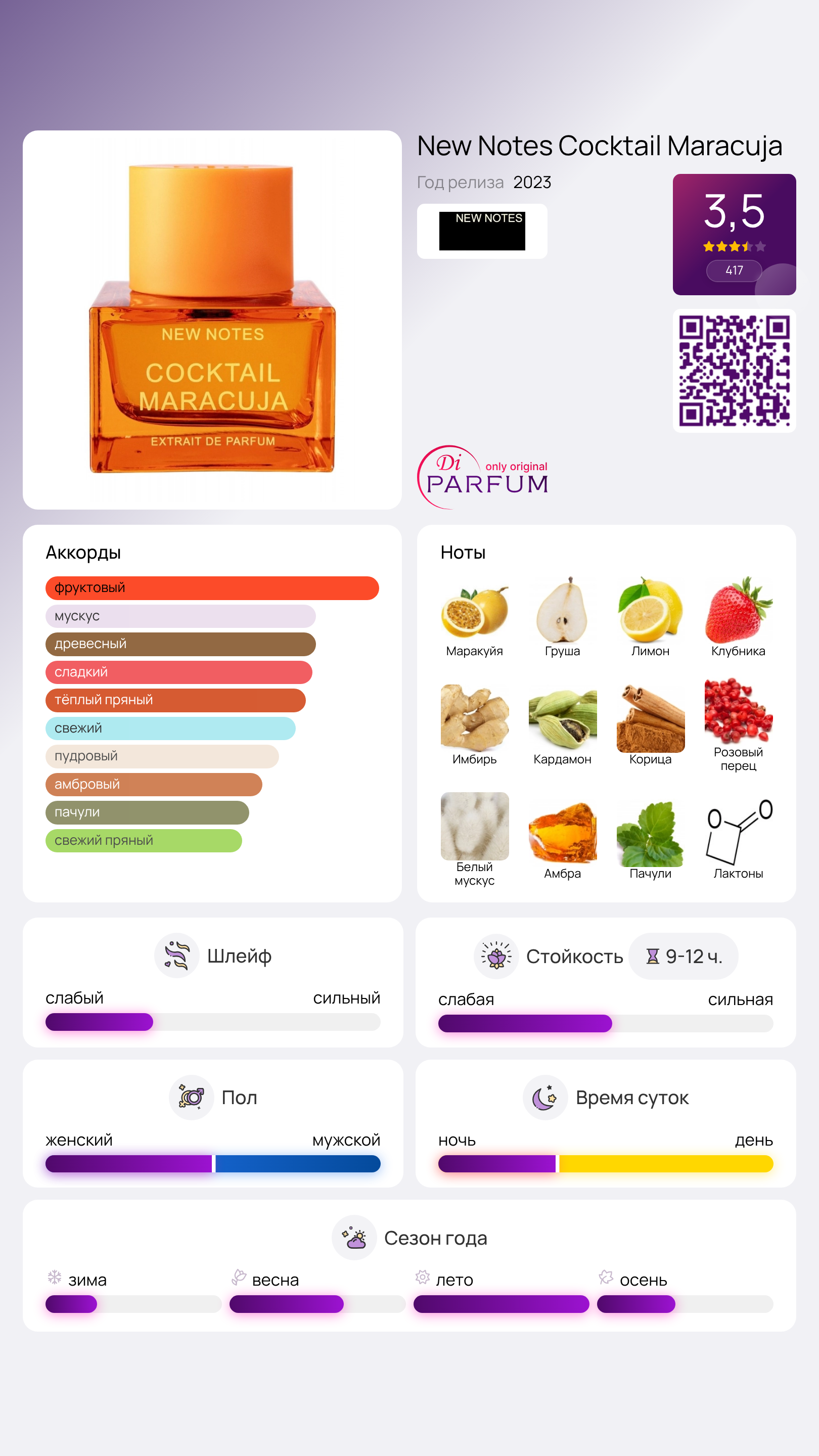 Финальные аккорды заключают в себе богатые ноты кедра, белого мускуса, амбры, пачули, ванили и молочных лактонов. New Notes Cocktail Maracuja — это богатая палитра, энергия лета, сочные фрукты и ароматные цветы. Этот парфюм способен поднять настроение, вызвать улыбку и сделать любой образ более стильным и запоминающимся с первого же вдоха.