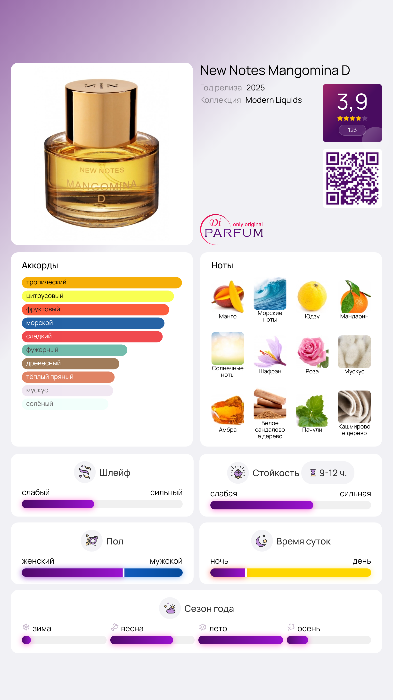 Mangomina D от New Notes — это цветочно-фруктовый аромат, созданный как для женщин, так и для мужчин. Этот новый аромат был представлен в 2025 году и сразу же завоевал популярность благодаря своей яркой и жизнеутверждающей композиции.