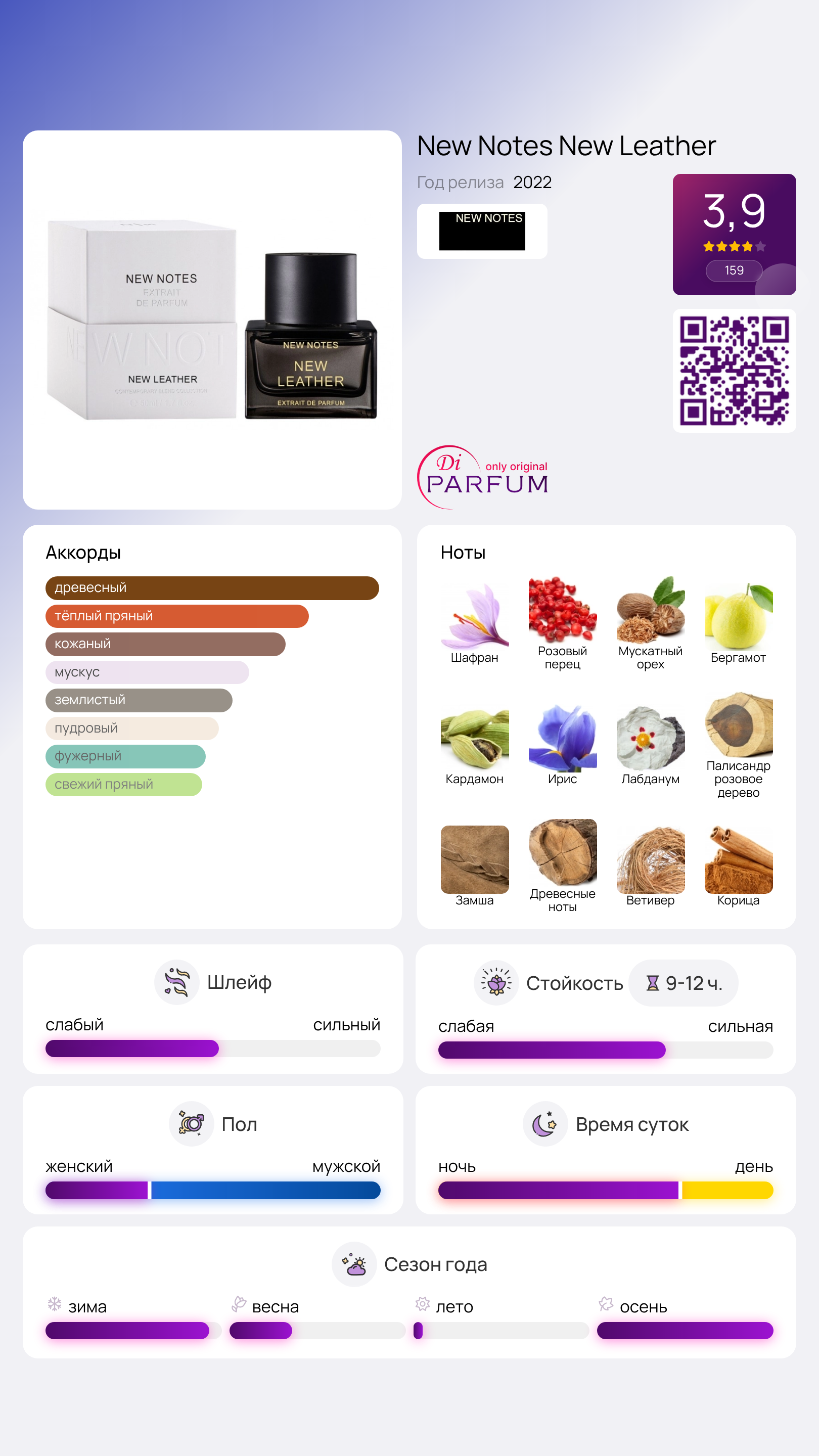 Аромат завершается теплой анималистической замшей, в которой скрыты бархатные и согревающие оттенки корицы, а также сухая терпкость ветивера и удивительная болотная гармония нагармоты. Это создает чувственный и незабываемый финал для New Notes New Leather.