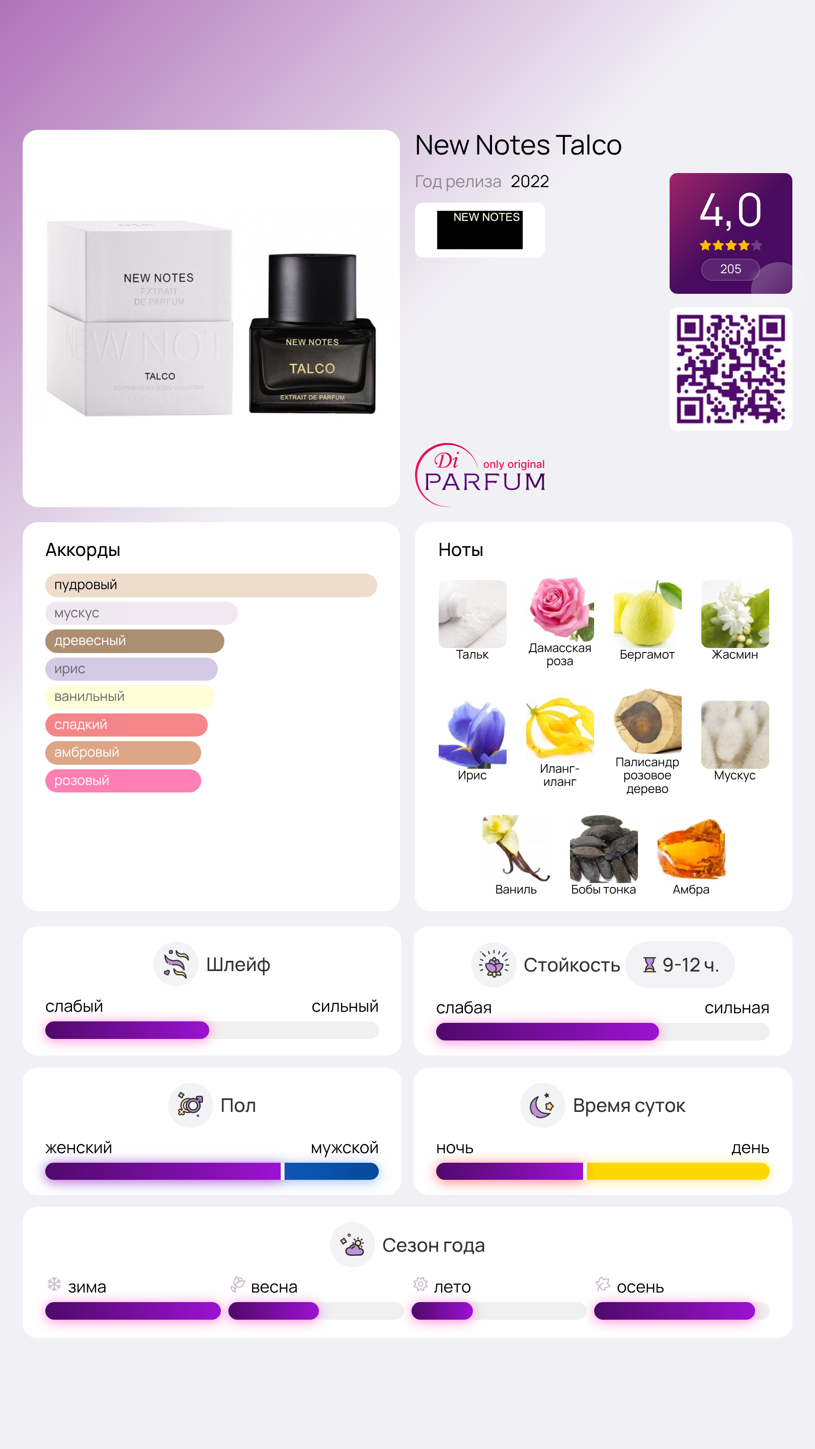 Talco от New Notes – это универсальный аромат для женщин и мужчин, который был представлен в 2022 году. Это новинка на парфюмерном рынке, которая сразу привлекает внимание своей уникальной композицией.