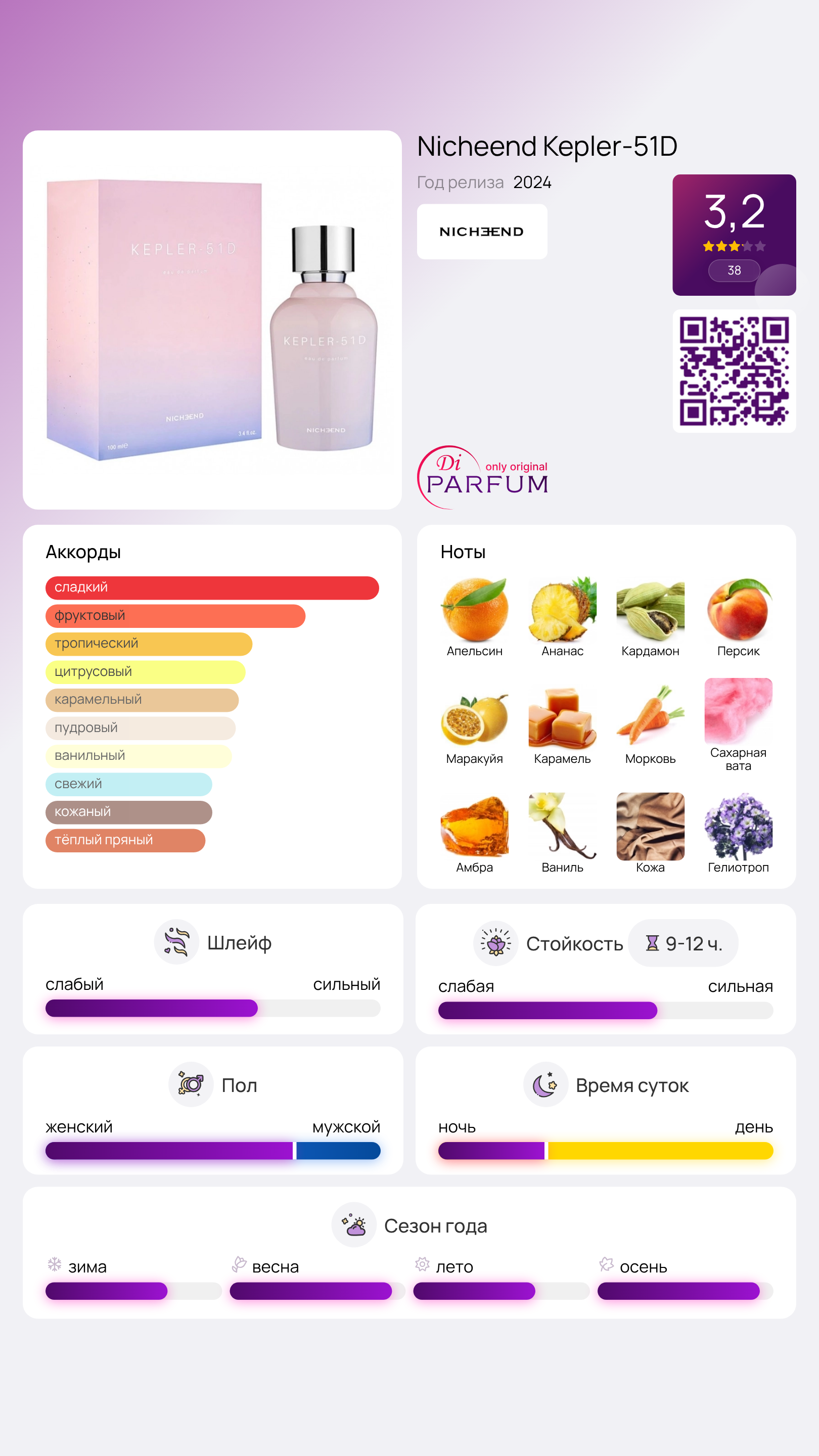 Сладость сливочной карамели гармонирует с терпкими оттенками семян моркови, в то время как теплый амбровый шлейф дополнен нотами гелиотропа и мягкой кожи, напоминающей замшу. Композиция Kepler-51D была представлена французским брендом на выставке ESXENCE 2024, и ее нежно-розовый флакон символизирует сладкие мечты.