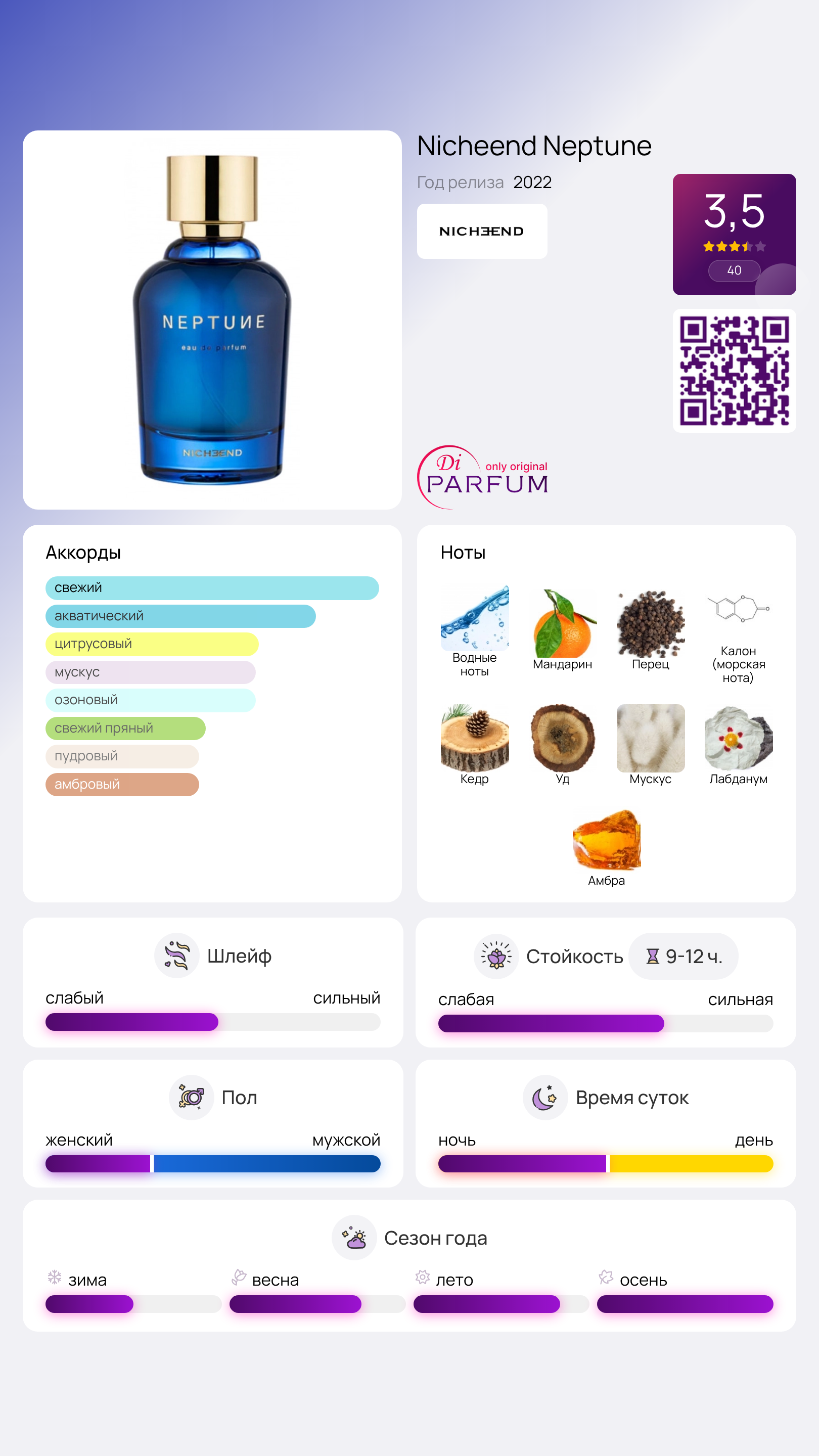 Яркая композиция Neptune от Nicheend отражает волшебство безграничной Вселенной. Этот парфюм был выпущен в 2022 году турецким брендом, ставшим популярным за короткий срок. Он входит в "коллекцию 18-ти планет" под названием Universe, а оттенок оригинального флакона акцентирует водную свежесть содержимого.