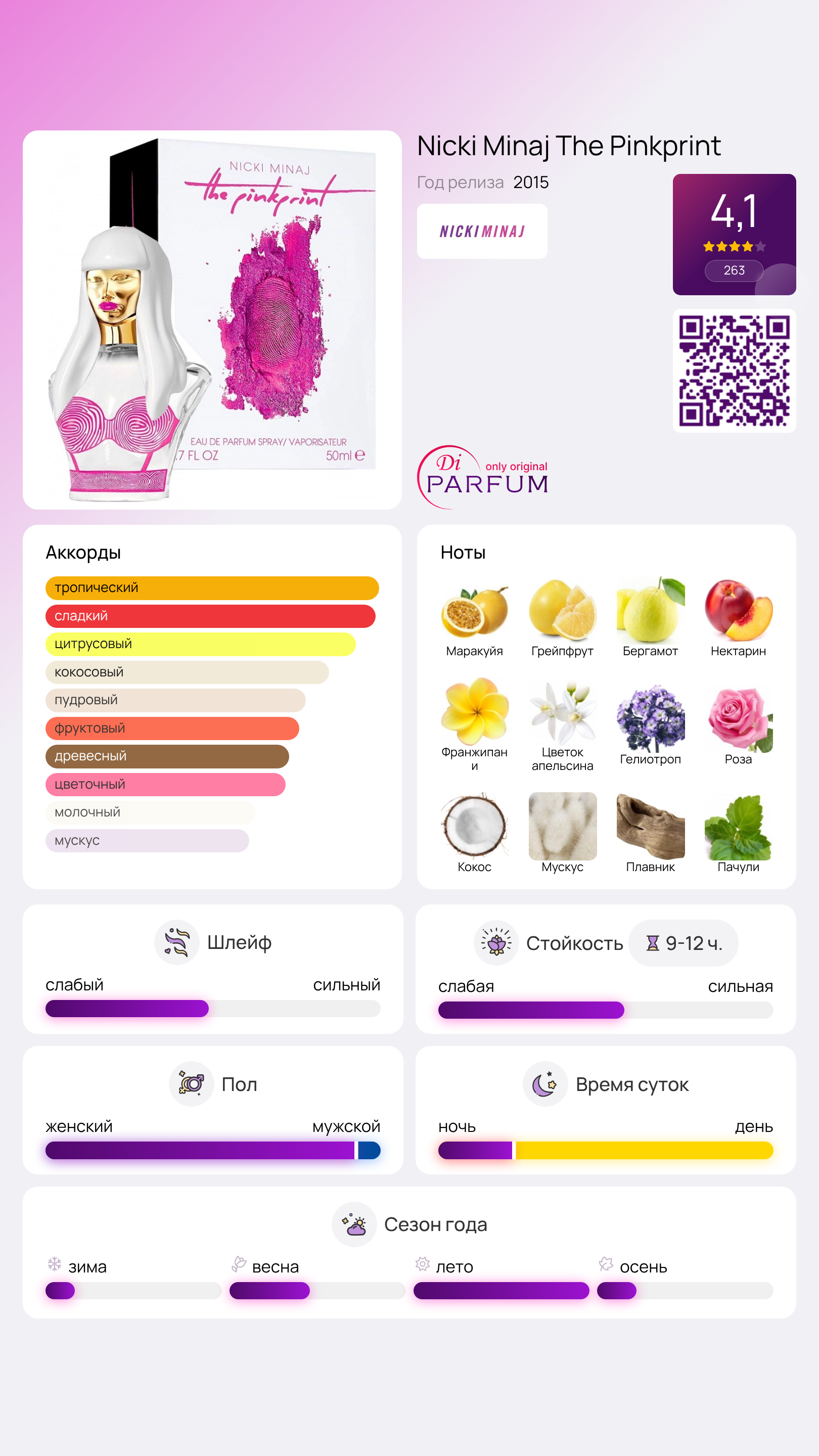 Парфюмерная линия The Pinkprint, представленная в 2015 году американской певицей и основательницей бренда Nicki Minaj (Ники Минаж), предлагает очаровательный фруктово-цветочный аромат. Этот яркий парфюм с кисловато-сладкими нотами, заключенный в стильный и женственный флакон, воплощает теплые весенние и летние оттенки, притягивая внимание с первых аккордов.
