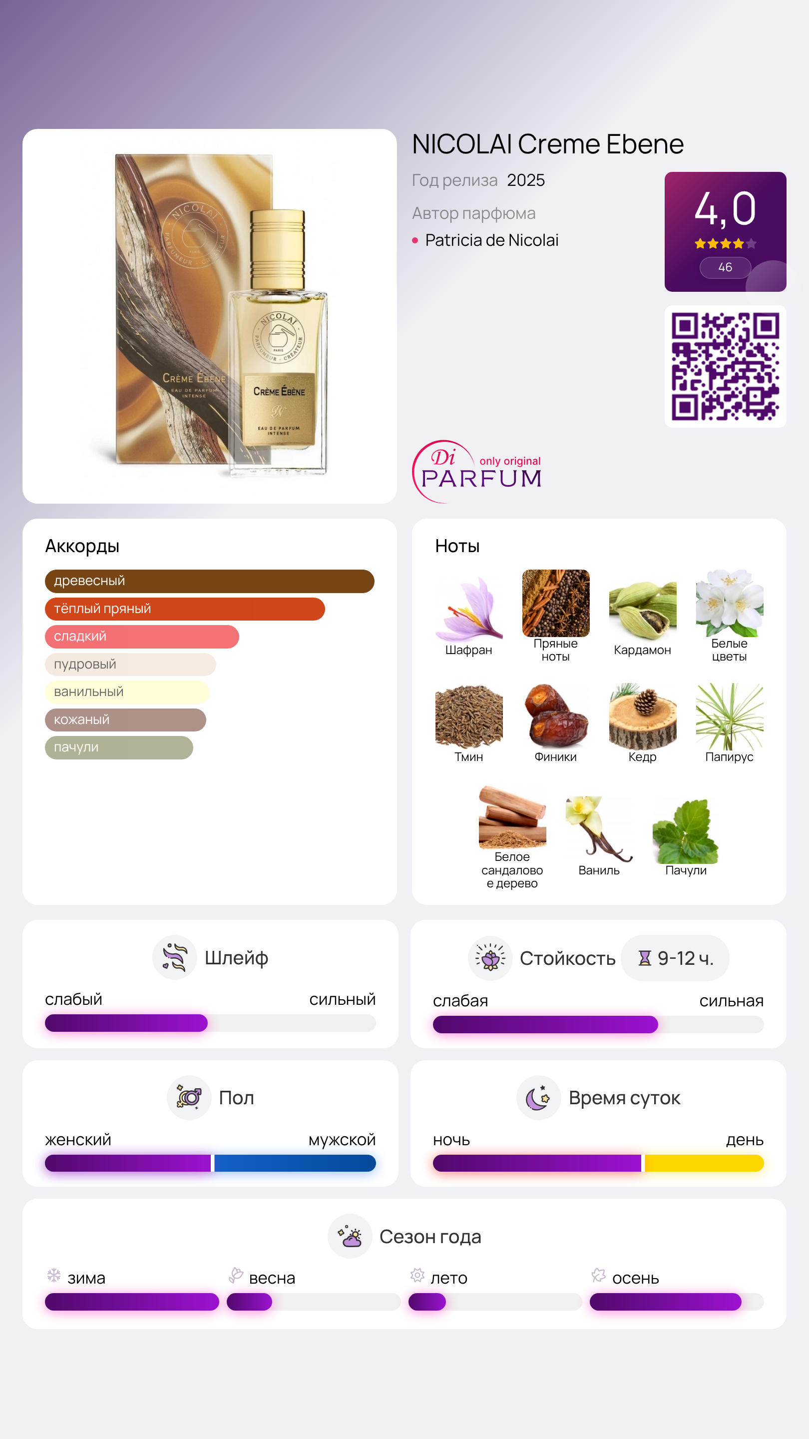 Crème Ébène от Nicolai Parfumeur Createur – это восточно-древесный аромат, созданный для мужчин и женщин. Новый аромат был представлен в 2025 году, и его композитором стала известный парфюмер Патриция де Николаи.