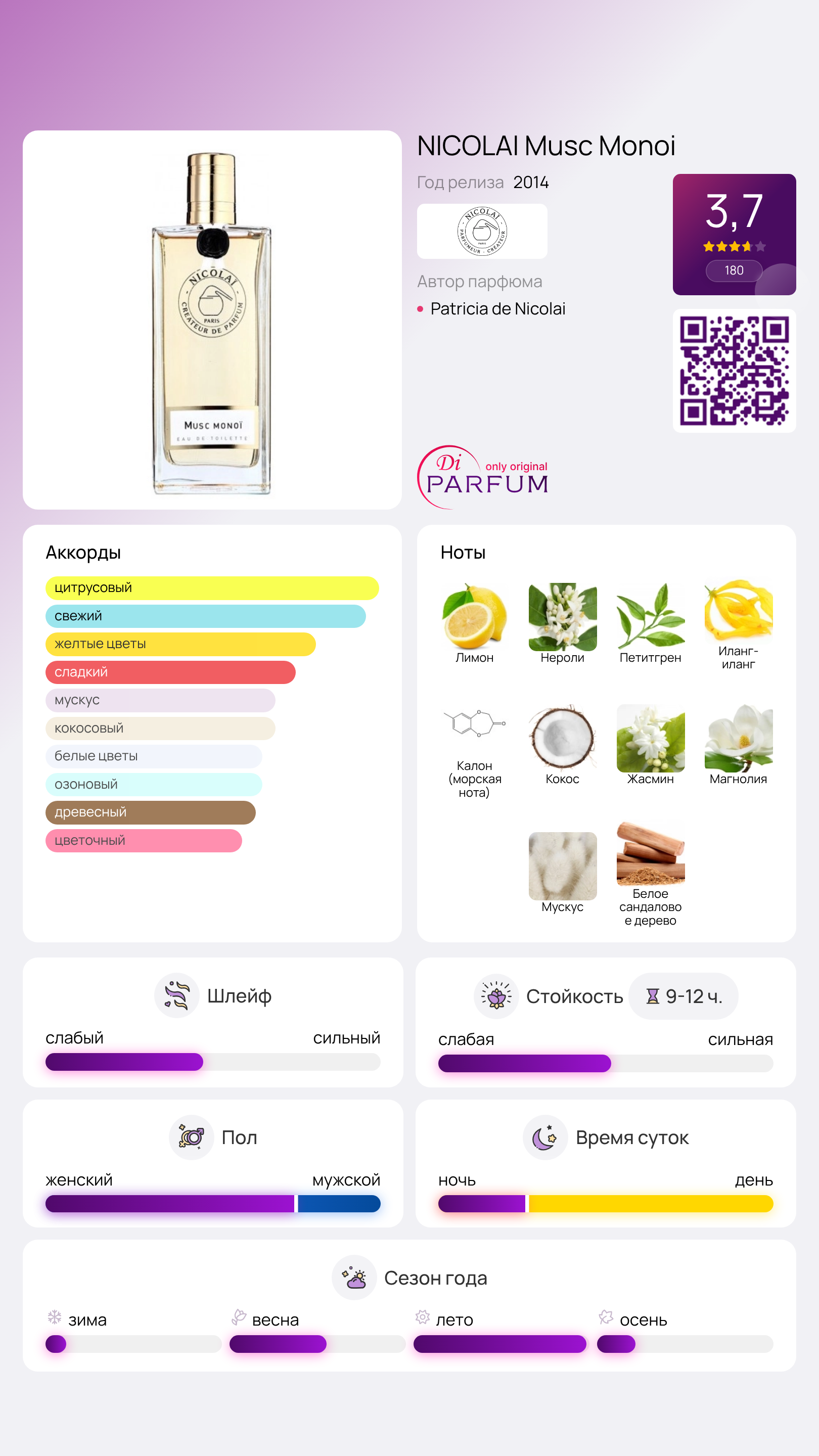 На фоне цитрусовых и нероли звучат томные нюансы жасмина с легкой индольной нотой, а волны иланг-иланга добавляют чувственности. Их освежает кокосовый холод и землистый дым ветивера, оставляя лишь легкие следы, напоминающие о их присутствии. Магнолия присоединяется к этому великолепию, как будто затекая в локоны, с нежной, экзотической медовостью на выдохе. В базе NICOLAI Musc Monoi сандал, сливочный и миндальный, соединяется с древесными тонами, внося прохладу ночи и тишину, в которой сверкает счастье и наслаждение белого мускуса.