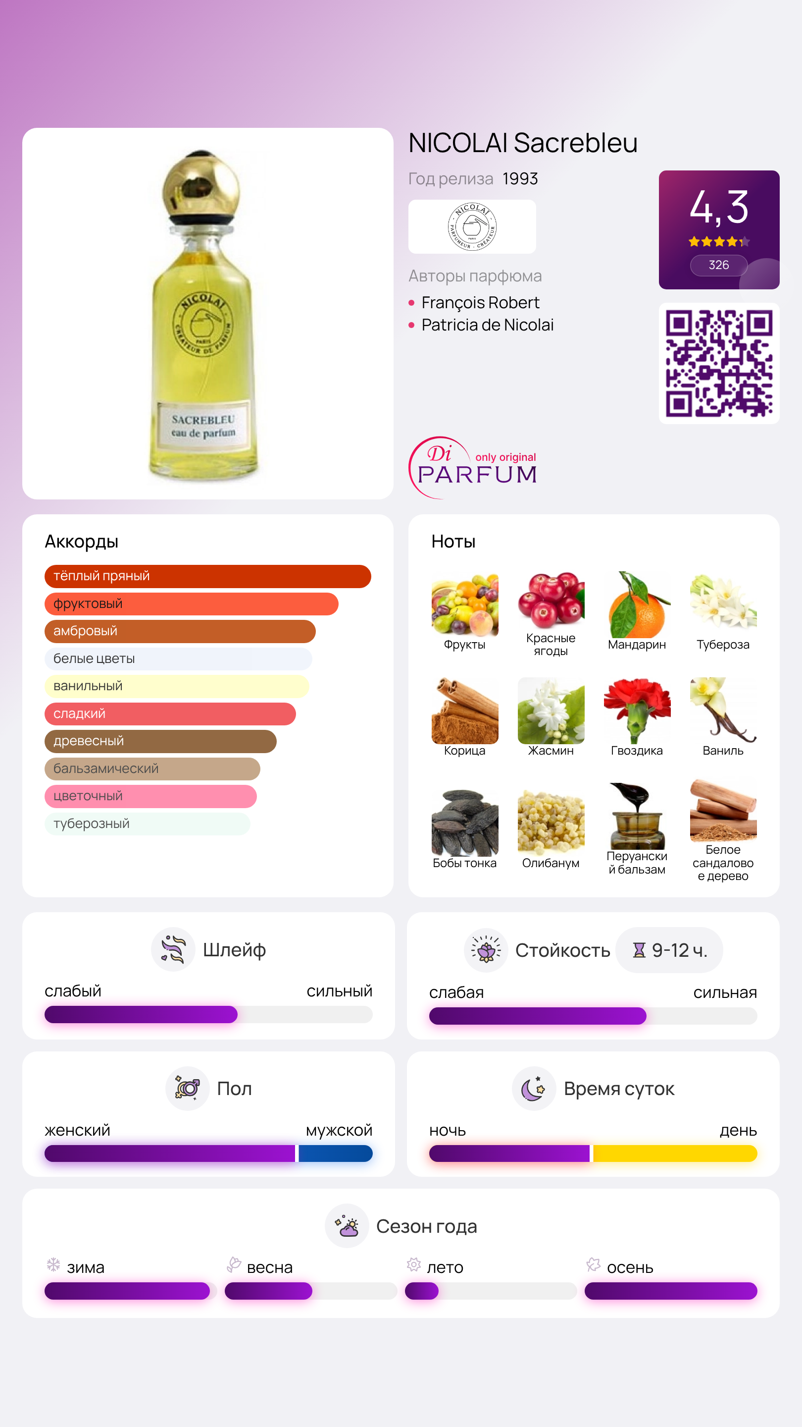 Ароматическая композиция NICOLAI Sacrebleu впечатляет своим насыщенным соединением фруктовых оттенков с цветами и теплым ладаном. Работа над этой формулой заняла два года, с целью создать легкий восточный аромат с нотами ванили, который не напоминал бы сладости. Название фразы является восклицанием на французском. Этот аромат ассоциируется с прекрасным закатом, полным романтики, который больше о комфорте, чем о чем-то экстремальном.