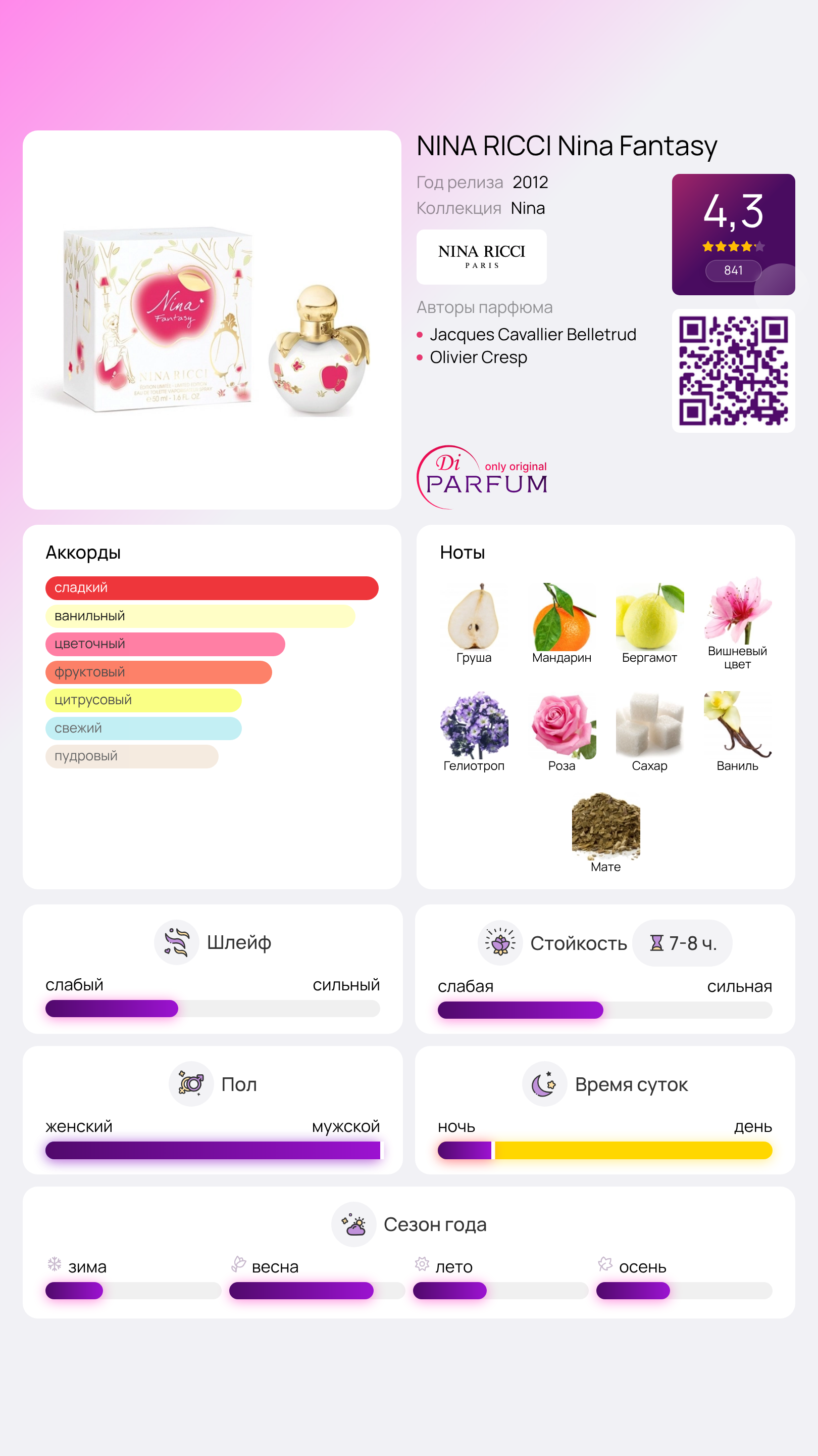 Nina Ricci Nina Fantasy представляет собой свежую романтическую интерпретацию ароматов линии Nina от Нины Ричи. Этот парфюм идеально подходит для холодных зимних вечеров, когда мысли полны надежд на приход весны. Он был выпущен в 2012 году и является лимитированной версией.
