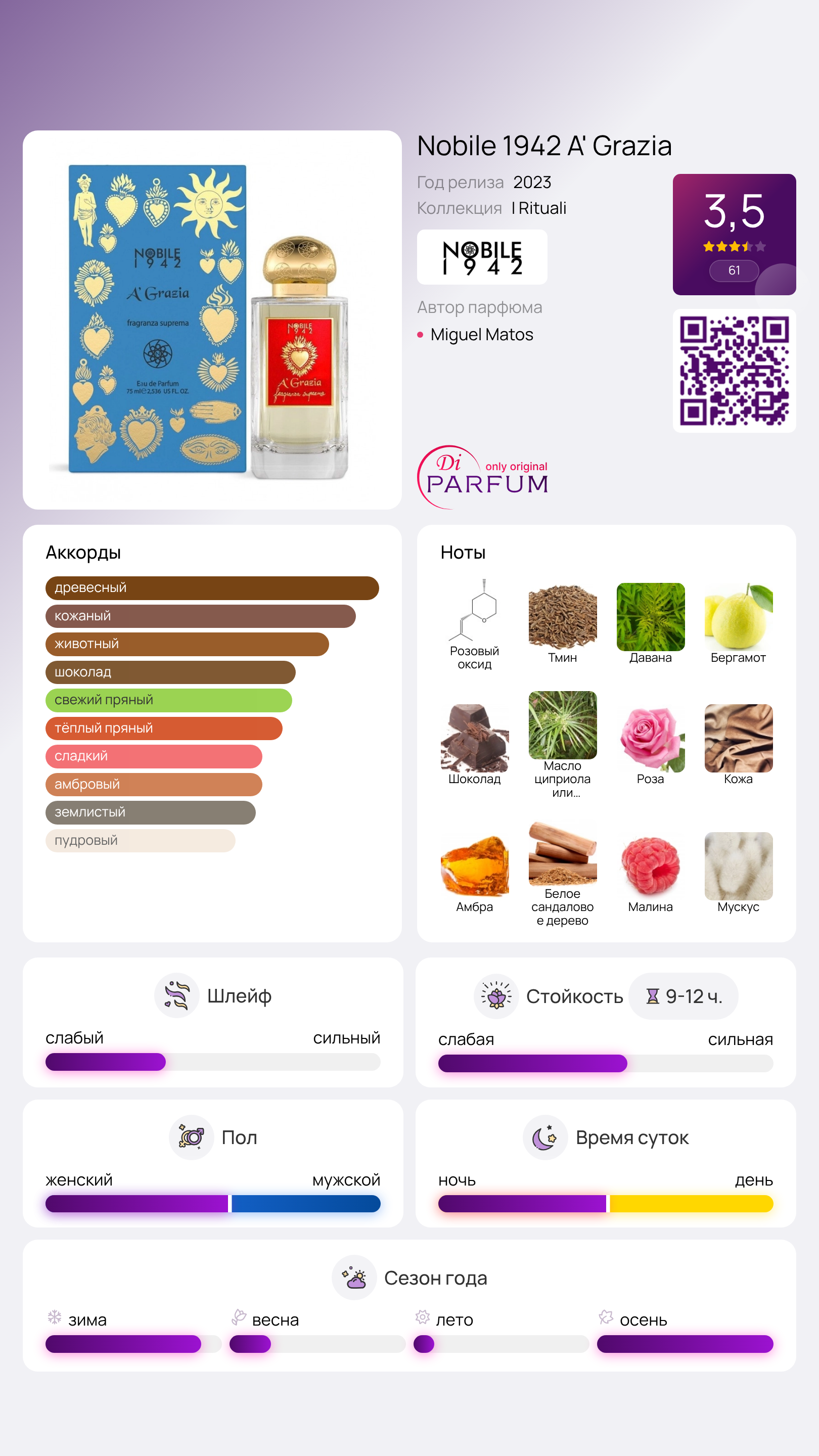 В названии этого элитного бренда четко отражён год его основания, что позволяет понять, какой большой путь он прошёл. Таким образом, каждый аромат из коллекции можно считать настоящим произведением искусства в мире парфюмерии. Один из таких ароматов — Nobile 1942 A' Grazia, который характеризуется цветочно-восточным стилем, сочетающим в себе утончённость и изысканность, а также яркость и запоминаемость.