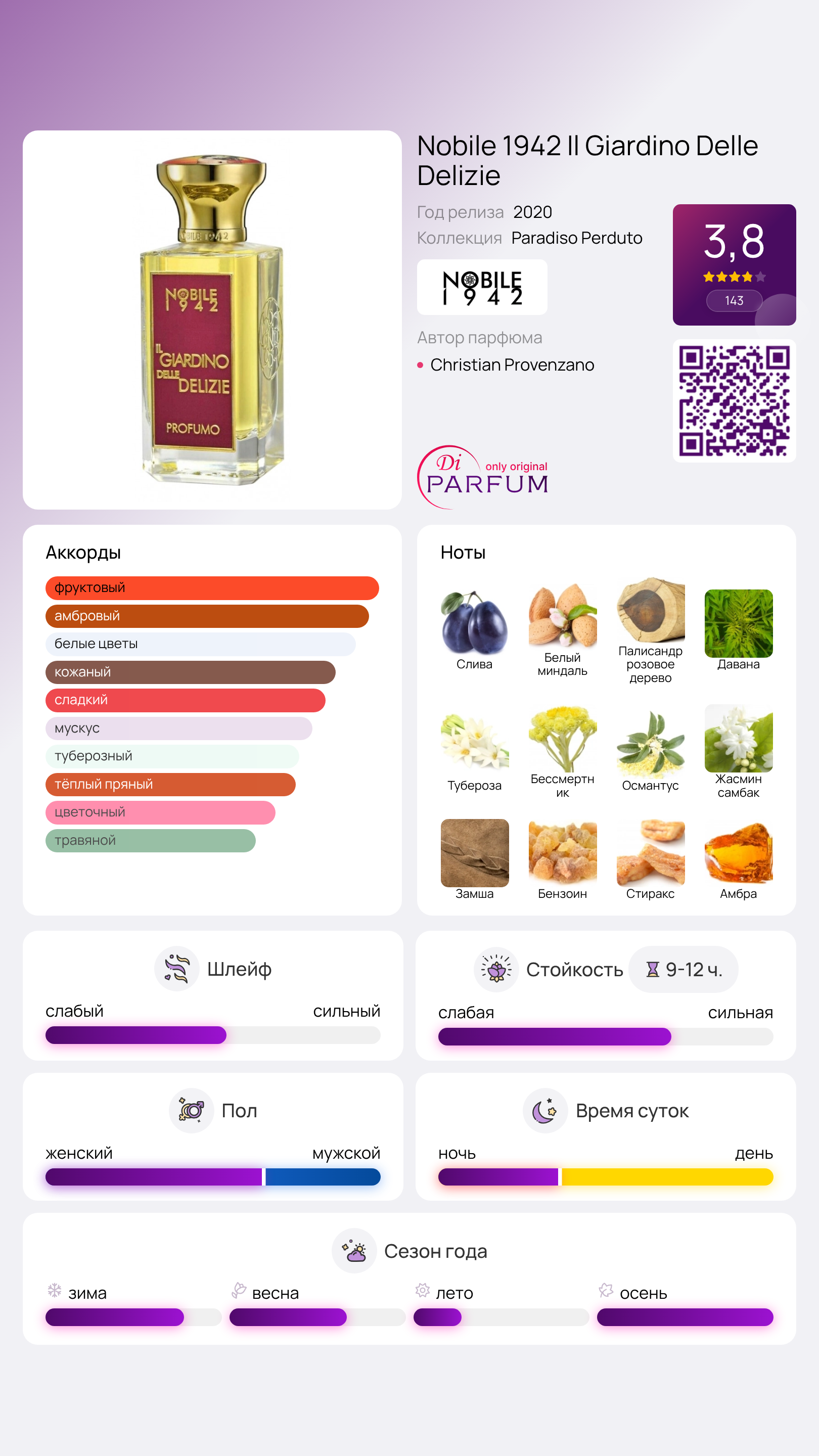 Итальянский «Сад Наслаждений» насыщен экзотическими цветами, плодами и афродизиаками, создавая обонятельные контрасты, подчеркивающие сложность восприятия. Верхние ноты раскрываются теплым ароматом давана и мягкостью миндального молока, в то время как сладость сочной сливы присутствует вместе с прохладной древесиной палисандра и пряной свежестью шафрана. В сердечных нотах парфюмерной композиции комбинируются сладко-травяной нарцисс и загадочный жасмин, а королевская пара – медово-пряная роза и чарующая тубероза – оттеняется сухостью с легкой травянистой нотой бессмертника.