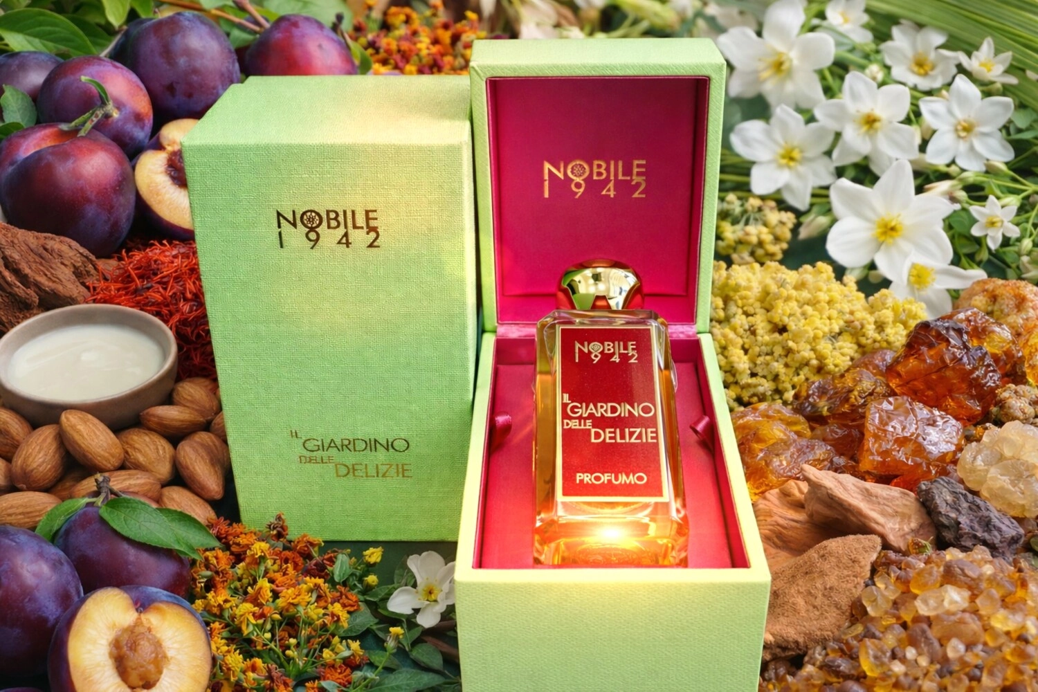 Парфюм Nobile 1942 Il Giardino Delle Delizie представляет собой романтичный цветочный восточный аромат, который сочетает в себе современность и элементы элегантной классики. Этот парфюм вдохновлен известным произведением «Сад земных прелестей» художника Иеронима Боша, которое находится в мадридском музее Эль-Прадо. Картина, полная сюрреализма, отображает человеческие слабости, грехи и внутренние противоречия, при этом содержит сатирические образы, основанные на христианских догмах Средневековья. На боковых панелях произведения виднеются божественные символы, в то время как реальность представлена в форме прозрачной сферы.