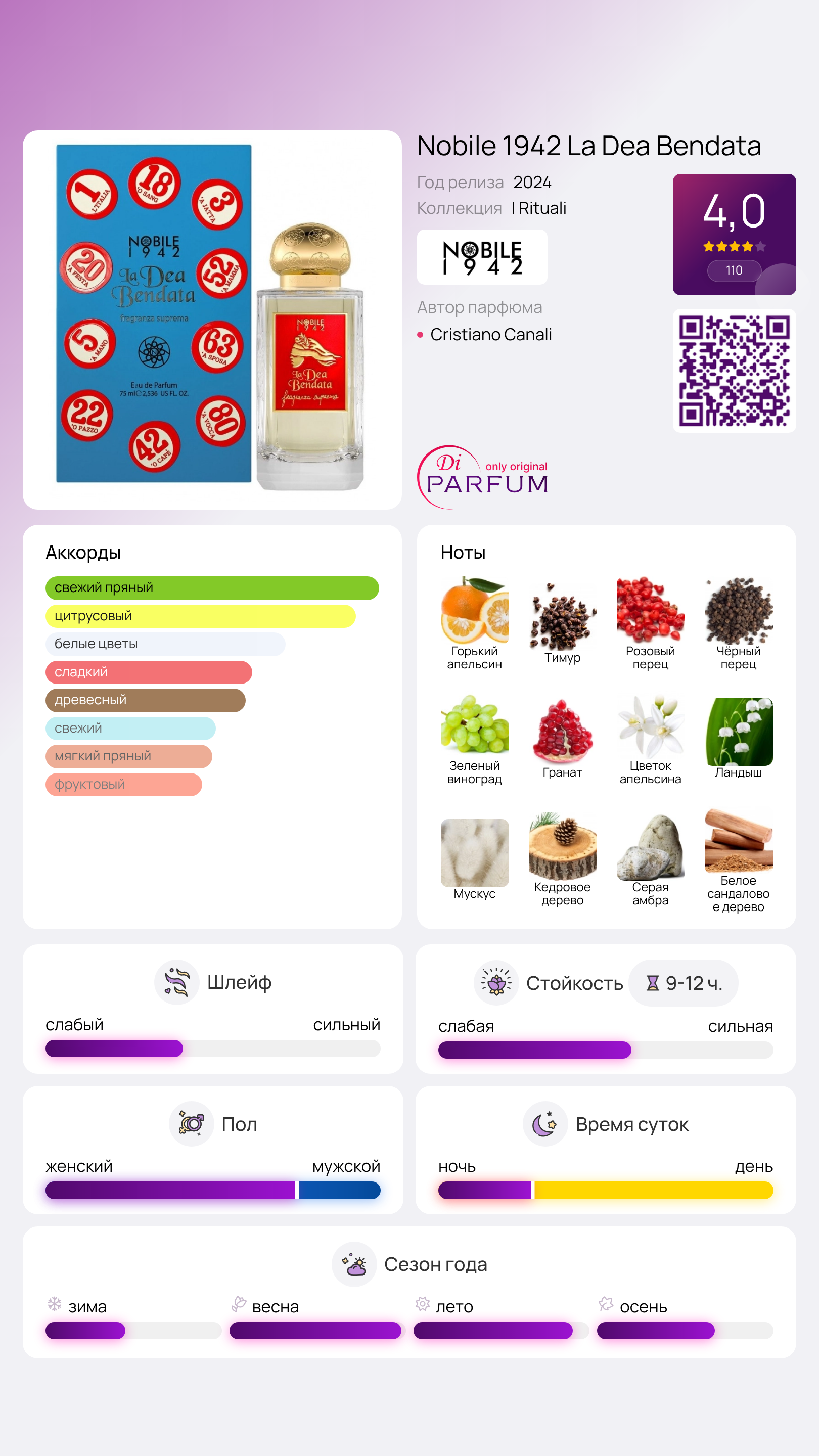 La Dea Bendata от Nobile 1942 — это уникальный древесно-пряный аромат, подходящий как для женщин, так и для мужчин. Этот новый состав был представлен в 2024 году, и за его создание отвечает талантливый парфюмер Кристиано Канали.