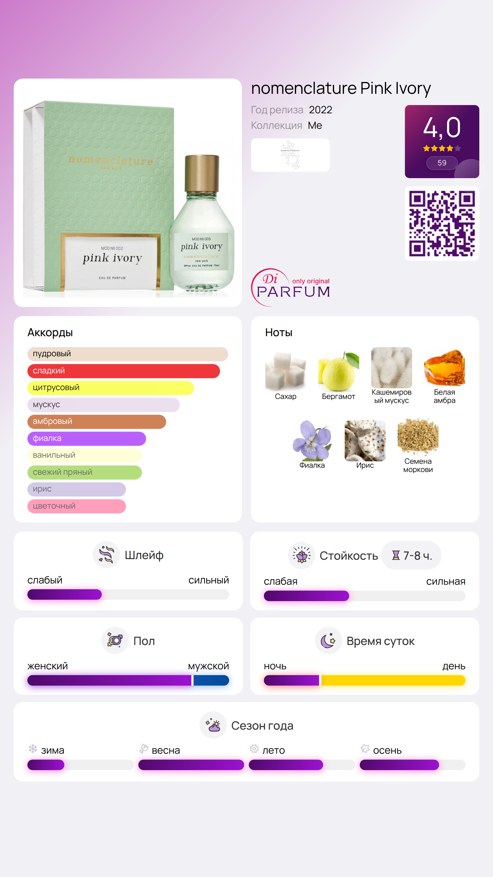 Завораживающий шлейф аромата наполняет пляжные ноты и сочетает в себе ориентальную белую амбру, сладкие кружевные нюансы и мягкий кашемировый мускус. Сахарный компонент создает контраст с игривым солоноватым подтекстом, что добавляет пикантности к кондитерским ощущениям. Pink Ivory от Nomenclature считается наиболее «резковато свежим» ароматом в своей коллекции из пяти универсальных парфюмов.