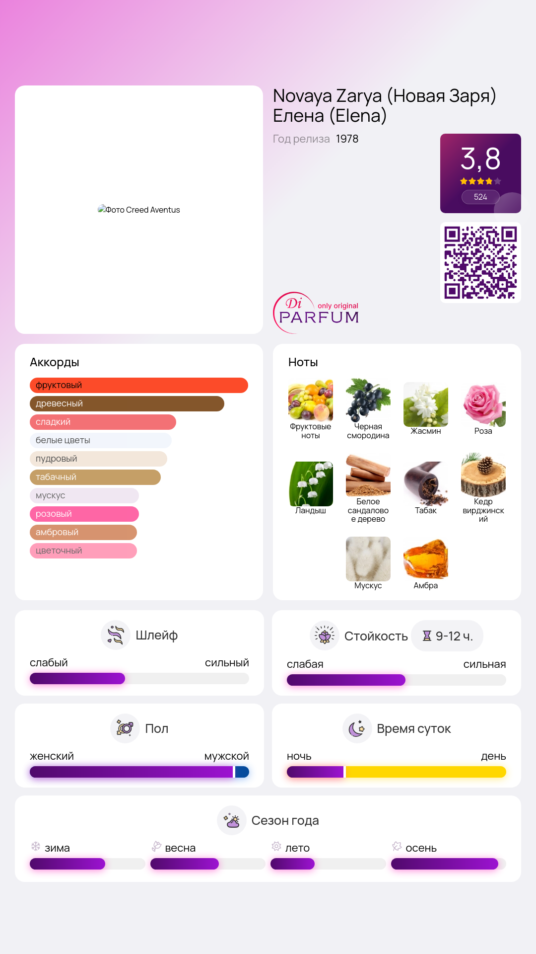 Елена (Elena) прекрасно подходит для повседневного использования и будет уместна как в офисе, так и на вечернем выходе. Этот аромат идеально дополнит вашу индивидуальность и подчеркнет вашу женственность. Позвольте себе окунуться в мир элегантности и сдержанной роскоши с Еленой от Новой Зари.