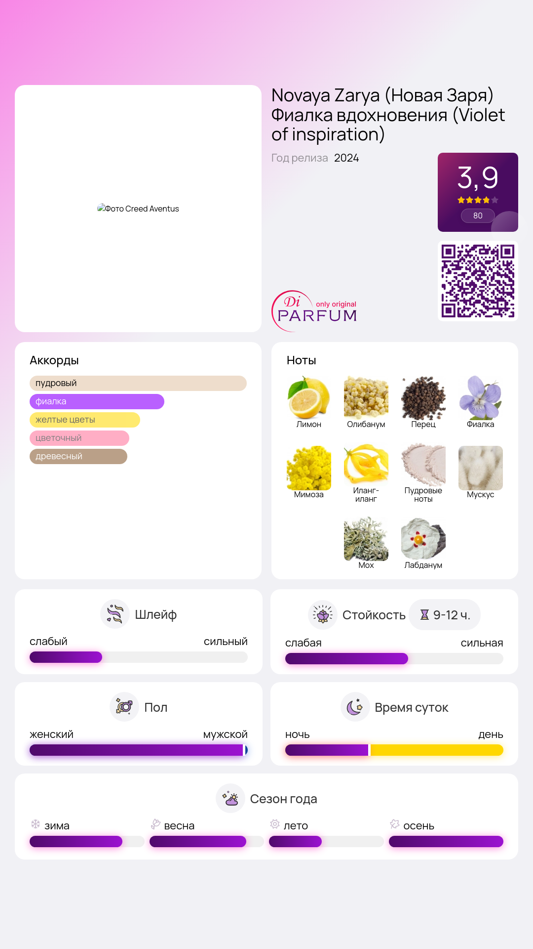 Этот аромат станет ярким дополнением вашей коллекции и поможет выразить вашу индивидуальность. Фиалка вдохновения — это не просто парфюм, это воплощение чувств и эмоций, которые стоит носить с собой в каждый важный момент жизни.