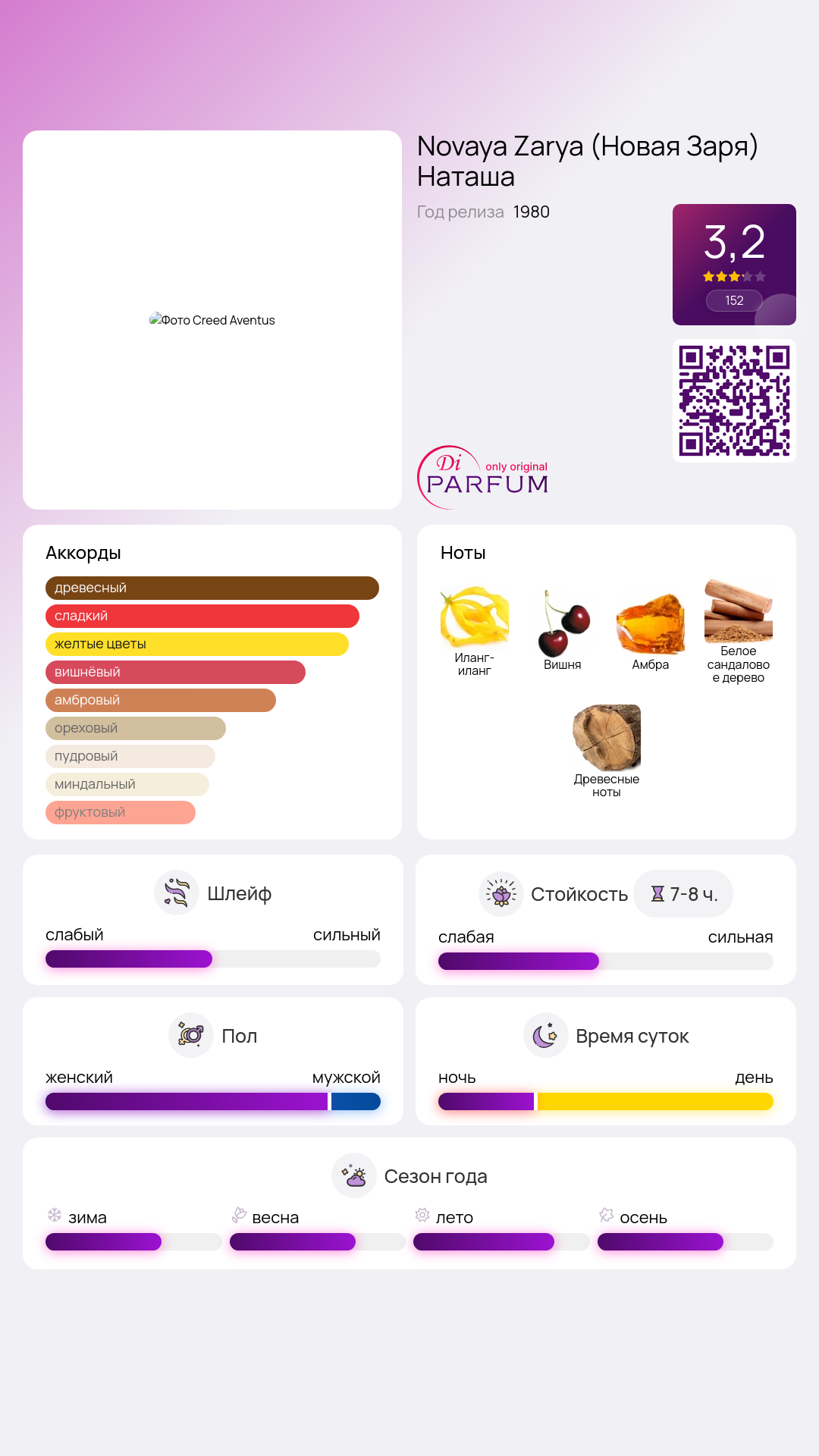 В базе представлены умиротворяющие ноты кедра и сандалового дерева, которые гармонично завершают композицию, а также добавленный мускус и пряные ноты, которые делают аромат более загадочным и интригующим. Наташа станет отличным выбором для женщин, которые ценят элегантность и оригинальность. Добавьте этот аромат в свою коллекцию и наслаждайтесь каждым мгновением!