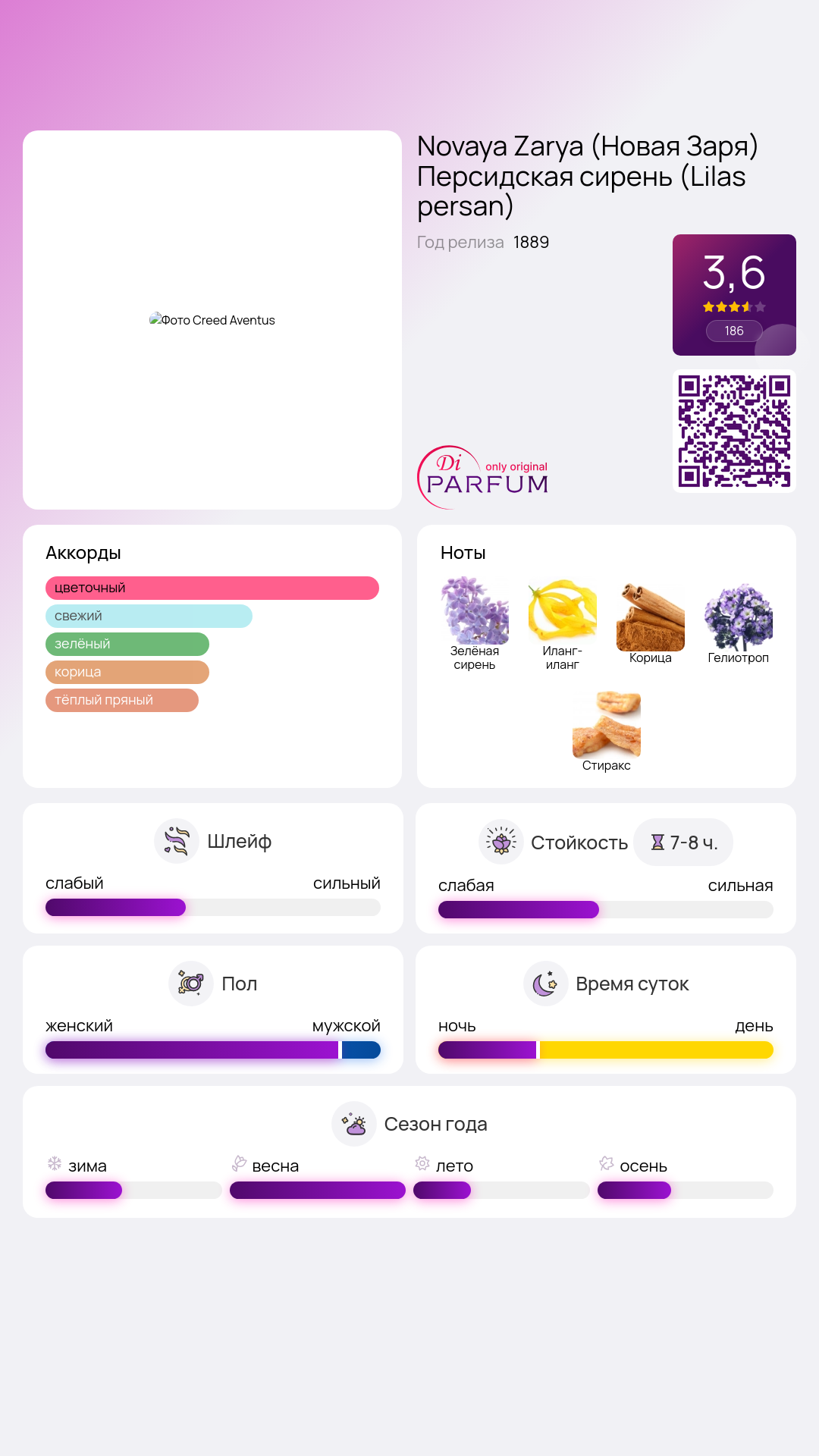 В сердце аромата звучат элегантные ноты сирени и иланг-иланга, придавая ему романтичность и загадочность. Эти цветочные аккорды переплетаются с тёплыми, уютными базовыми нотами – корицей, гелиотропом и стераксом, создавая гармоничное завершение аромата.