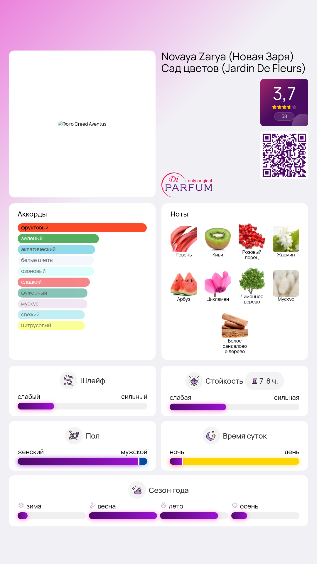 Jardin de fleurs от Новой Зари (The New Dawn) – это великолепный цветочный аромат для женщин, который погружает в мир свежести и разнообразия. С первых аккордов раскрываются яркие ноты ревеня, киви и розового перца, создавая приятное и игривое начало.