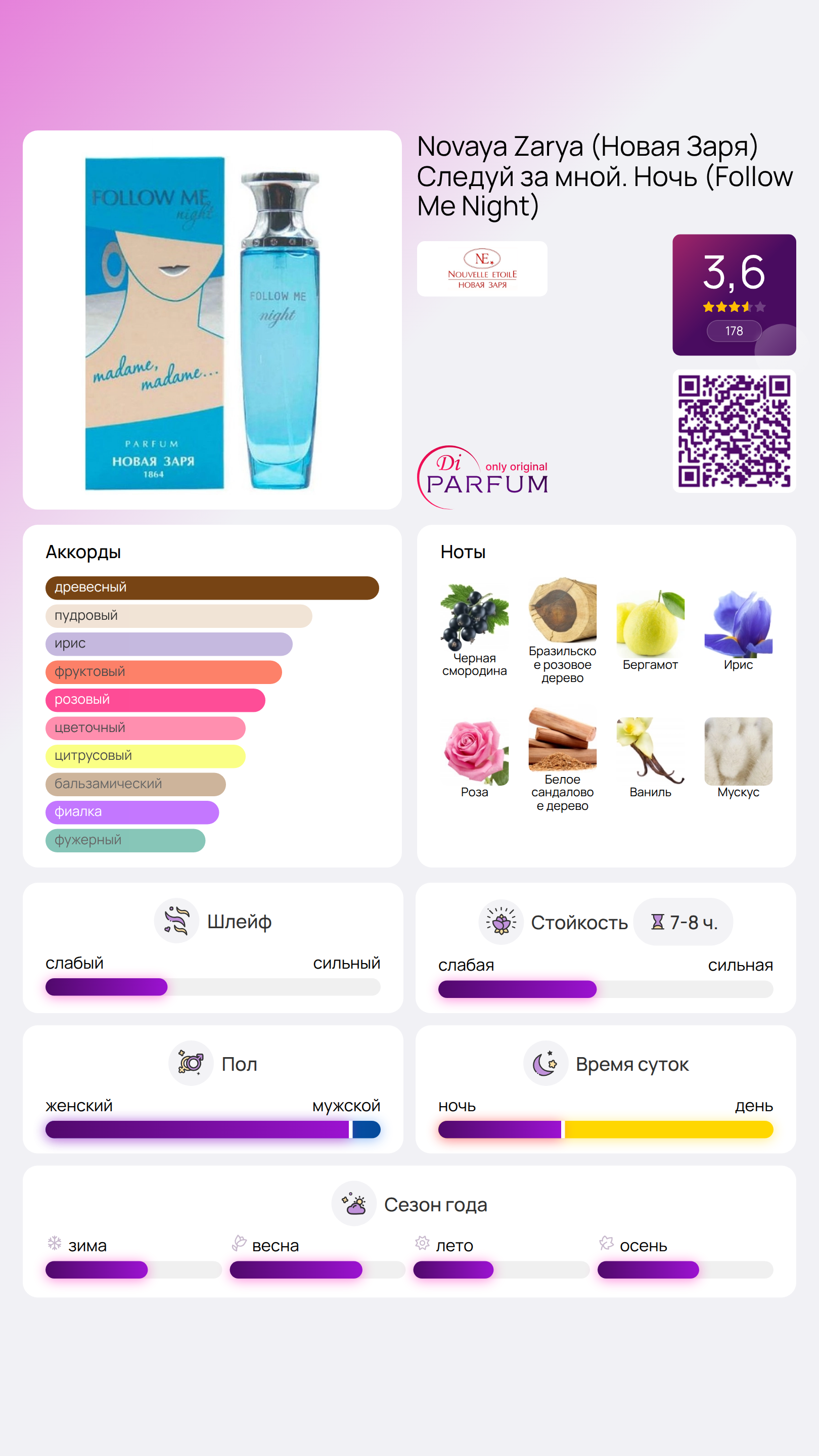 Follow Me Night – это отличный выбор для тех, кто ищет уникальный и запоминающийся аромат, который подарит вам уверенность и элегантность в любом случае.