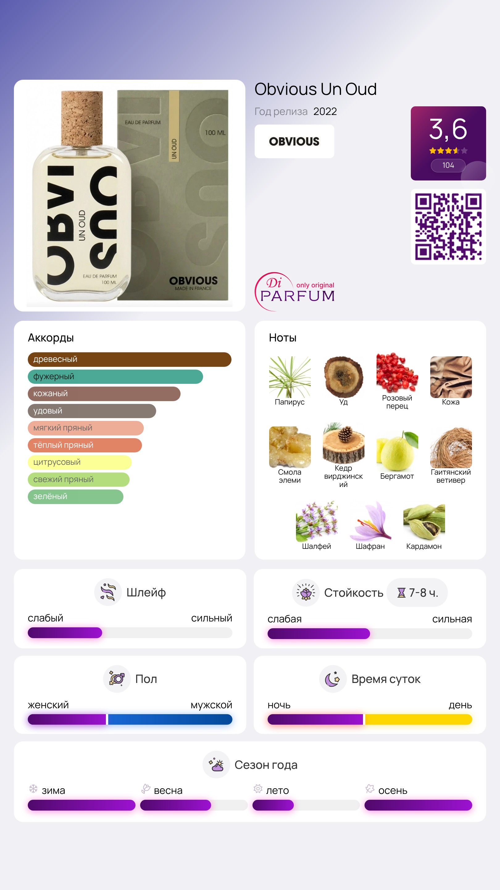 Эликсир Obvious Un Oud, обладая исключительным фужерным, пряным и древесным характером, прекрасно иллюстрирует знаменитую фразу: «Что нас не убивает, делает нас сильнее». В центре композиции находится аквилария красноватая, известная как лесной аристократ. Этот ценный уд, подверженный воздействию грибков, производит мифическую смолу, стоимость которой превышает золото. Качество, стойкость и диффузия этого компонента составляют суть данного эликсира.