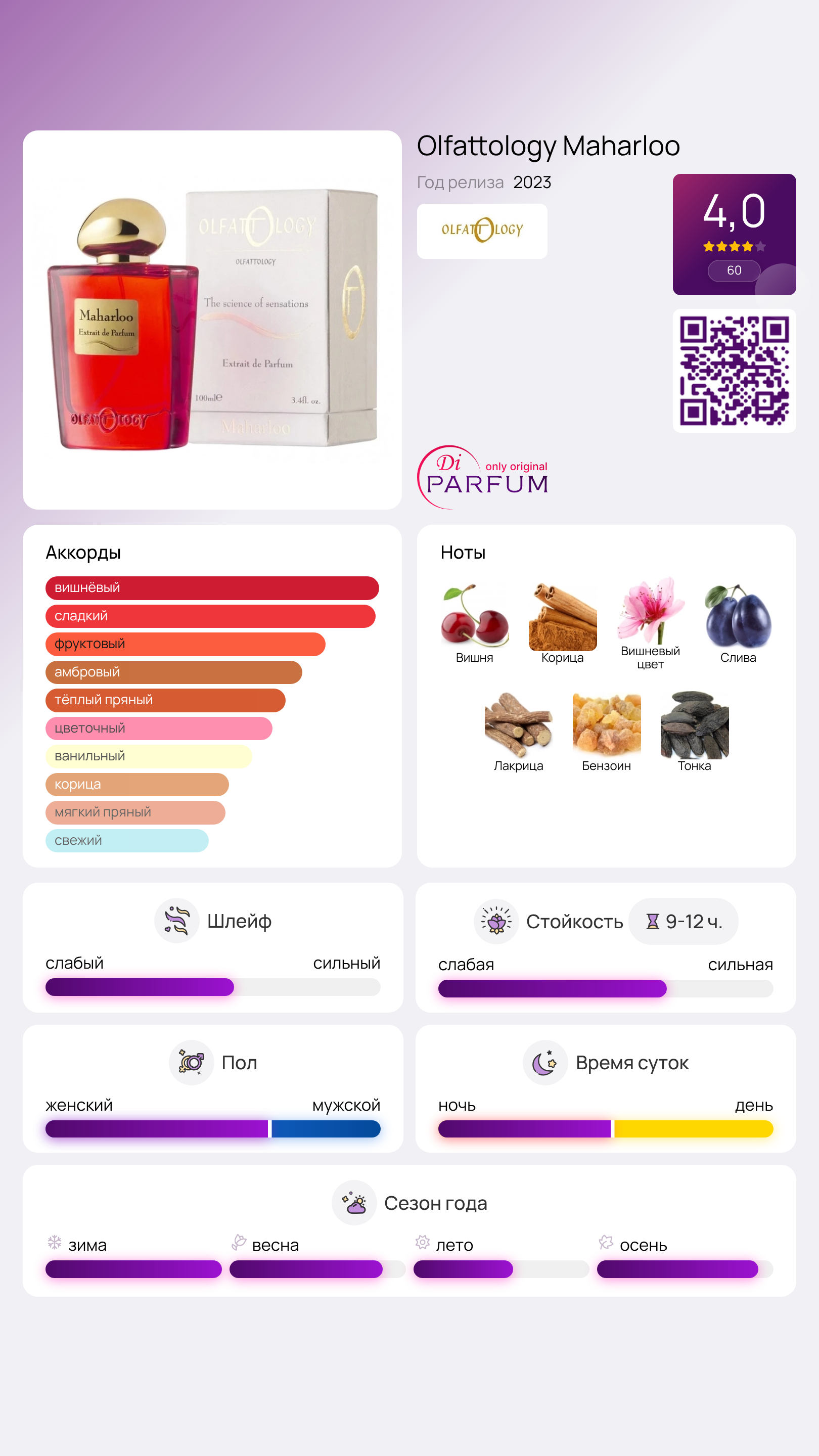 Maharloo от Olfattology – это не просто аромат, это эмоциональная метафора, пронизанная жизненной энергией. Этот парфюм был выпущен в 2023 году итальянским брендом и стал частью коллекции, посвященной знаковым озерам, рекам и водопадам. Округлый алый флакон с золотыми декорациями подчеркивает уникальную энергетику этого удивительного эликсира.