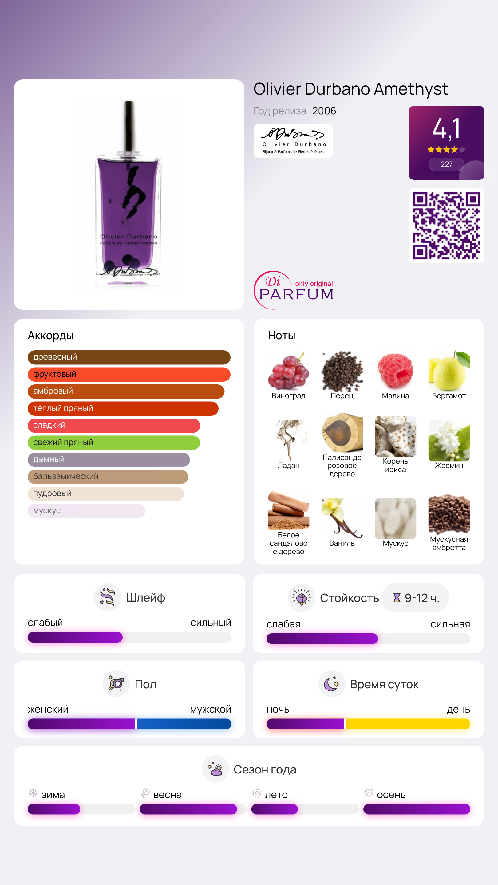 Парфюм Amethyst от Olivier Durbano представляет собой унисекс-аромат из древесно-пряной серии, который наполнен удивительной теплотой и атмосферой уюта. Он не содержит резких и навязчивых нот, а предлагает плавные, бархатистые акценты, основанные на верхних нотах бергамота, перца, винограда и спелой малины.