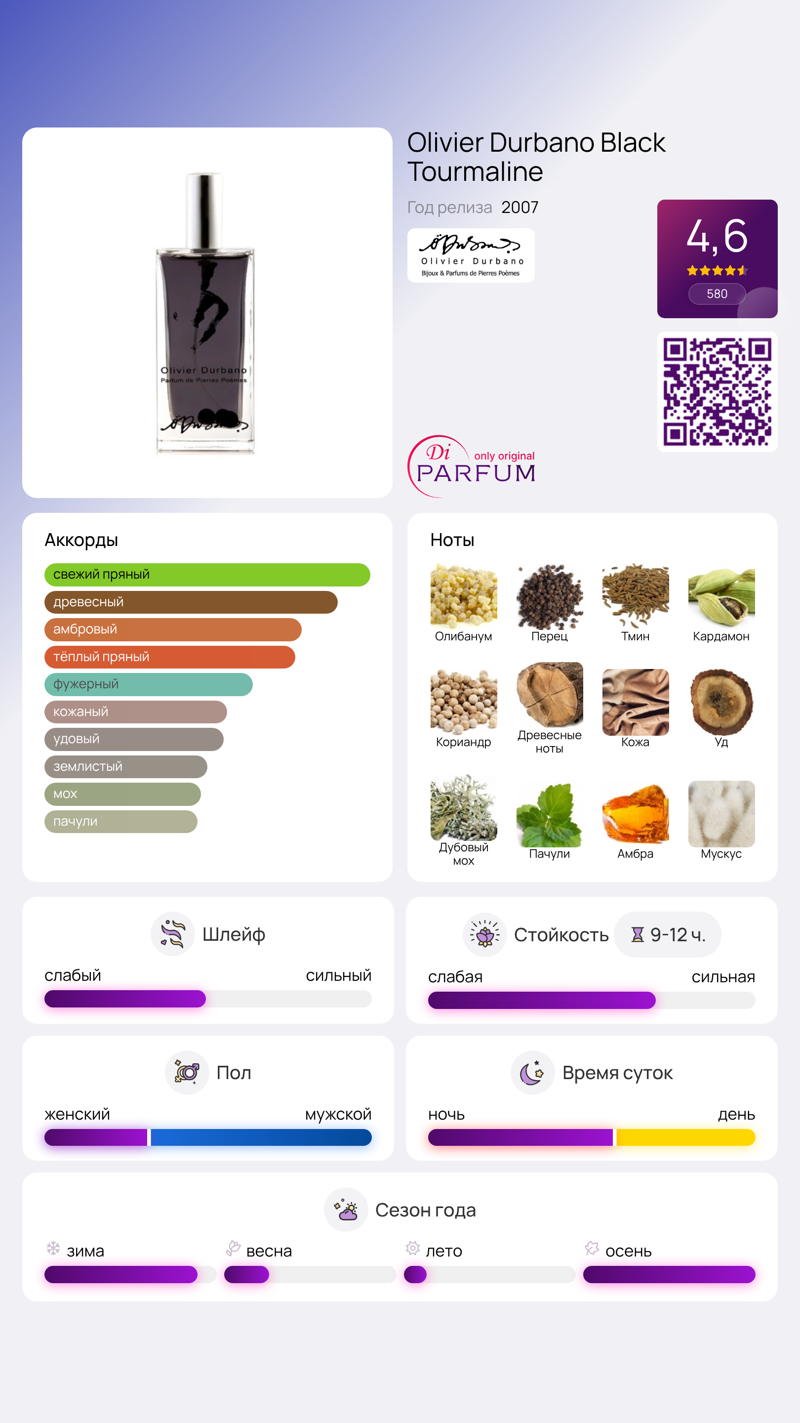Духи Black Tourmaline от Olivier Durbano, представляющие собой унисекс-древесно-пряный аромат, вдохновлены Черным Турмалином, камнем, обладающим, по легенде, способностью обращать негативные аспекты человеческой природы в позитивные. Аромат начинает свое путешествие с таинственной и пряной комбинации кориандра, тмина, олибанума, кардамона и перца.