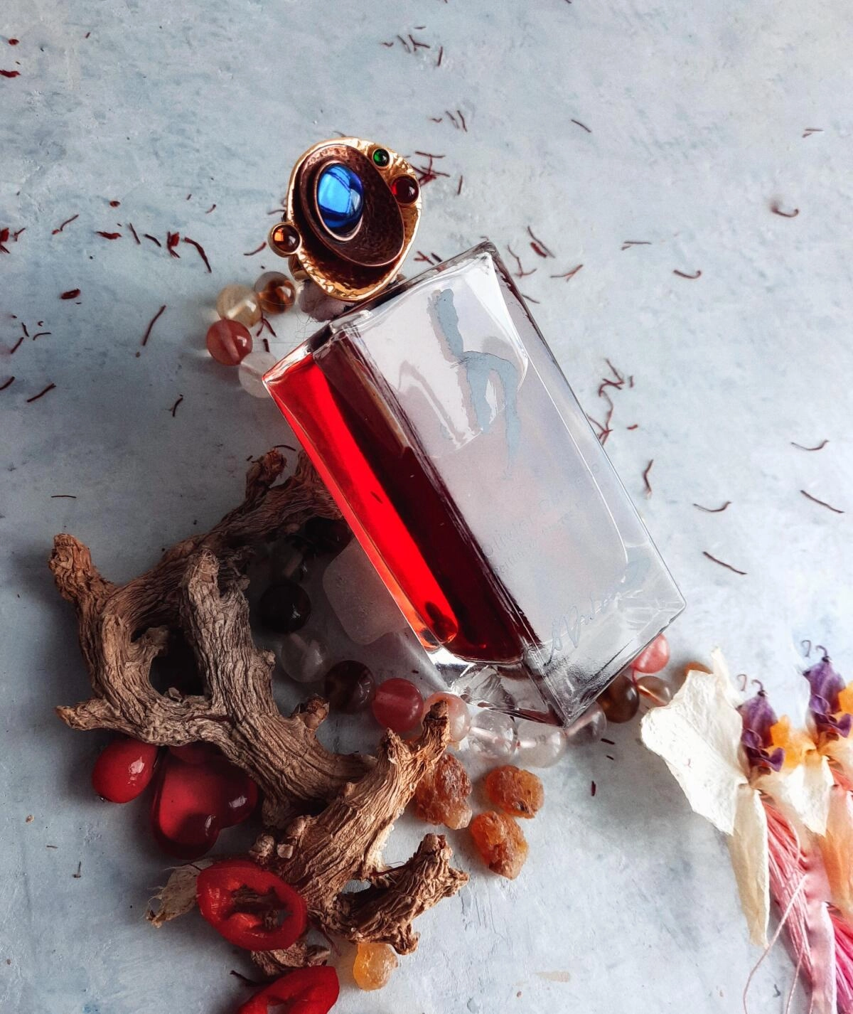 Основой ароматической структуры является миндально-ванильный гелиотроп, представленный в виде фиолетового цветка. Он удачно сочетает в себе пряные ноты шафрана и пикантную остроту чили, создавая бархатное звучание, которое выделяется среди смолистых и пряных оттенков. Блеск смолистого элеми гармонирует с ароматами ладана и имбиря, образуя легкую дымку.