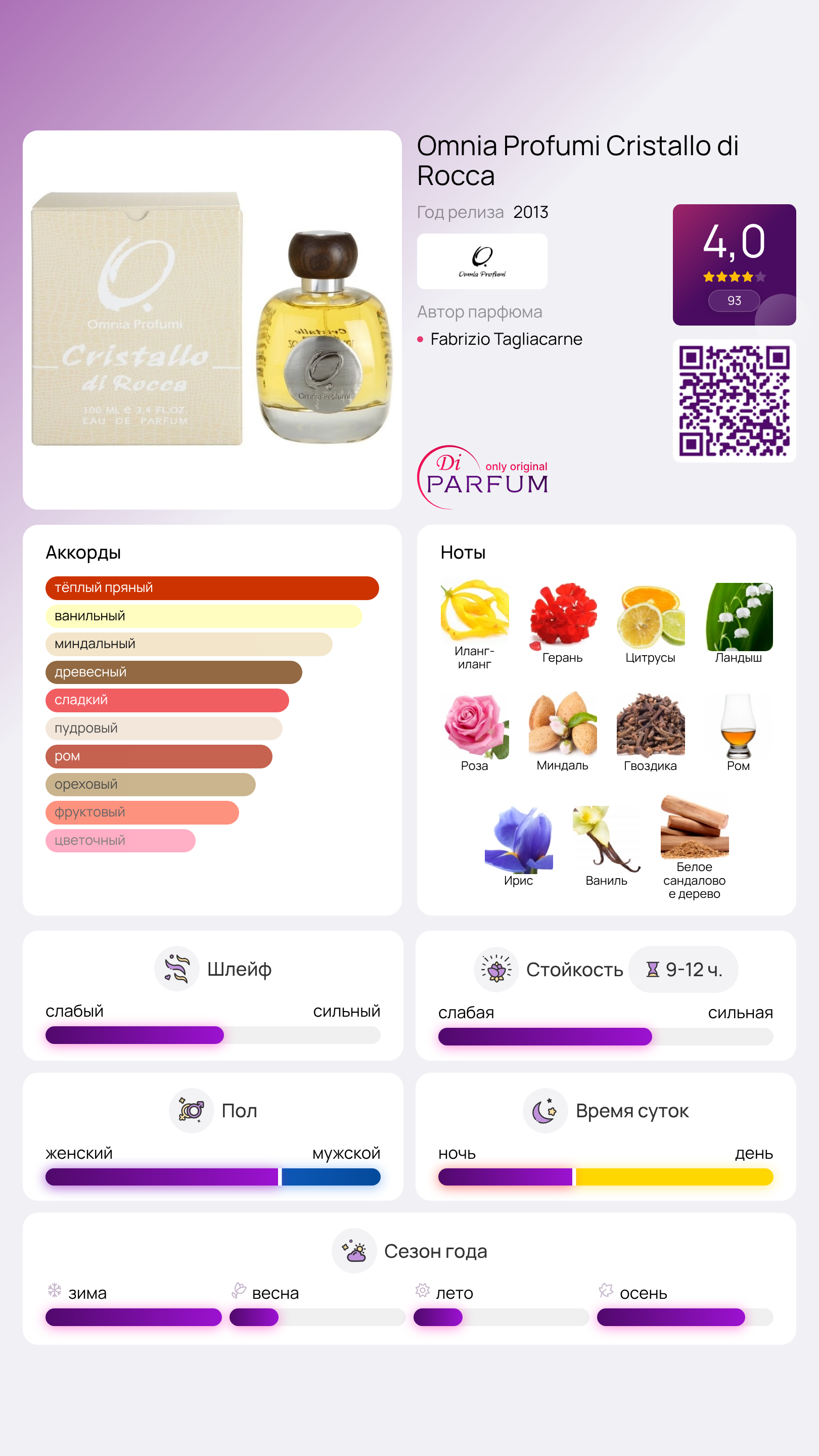 Дополнительно, в композиции присутствует множество приятных, ненавязчивых специй. Цветочный аспект аромата поддерживают звонкий ландыш и медовая роза, что придаёт общему букету эмоциональную насыщенность. Легкий аромат Cristallo di Rocca от Omnia Profumi будет вашим сопровождением, обостряя восприятие при каждом движении, но при этом не вызывая усталости.