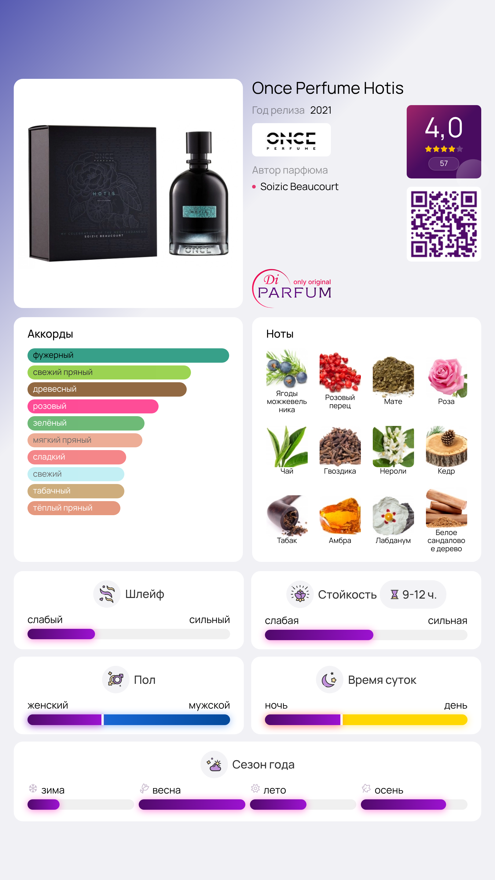 Восточная амбра, смолистый кедр и кремовый сандал погружаются в загадочную атмосферу лабданума, создавая многогранный финал. В завершение звучит дымный табак, не имеющий запаха «пепельницы». Эта стильная композиция Hotis от Once Perfume разработана для мужчин и женщин, которые ценят природные ароматы. Эта парфюмерная вода была выпущена известным итальянским брендом в 2021 году и представлена в элегантном бутылочке с темными градиентными оттенками.