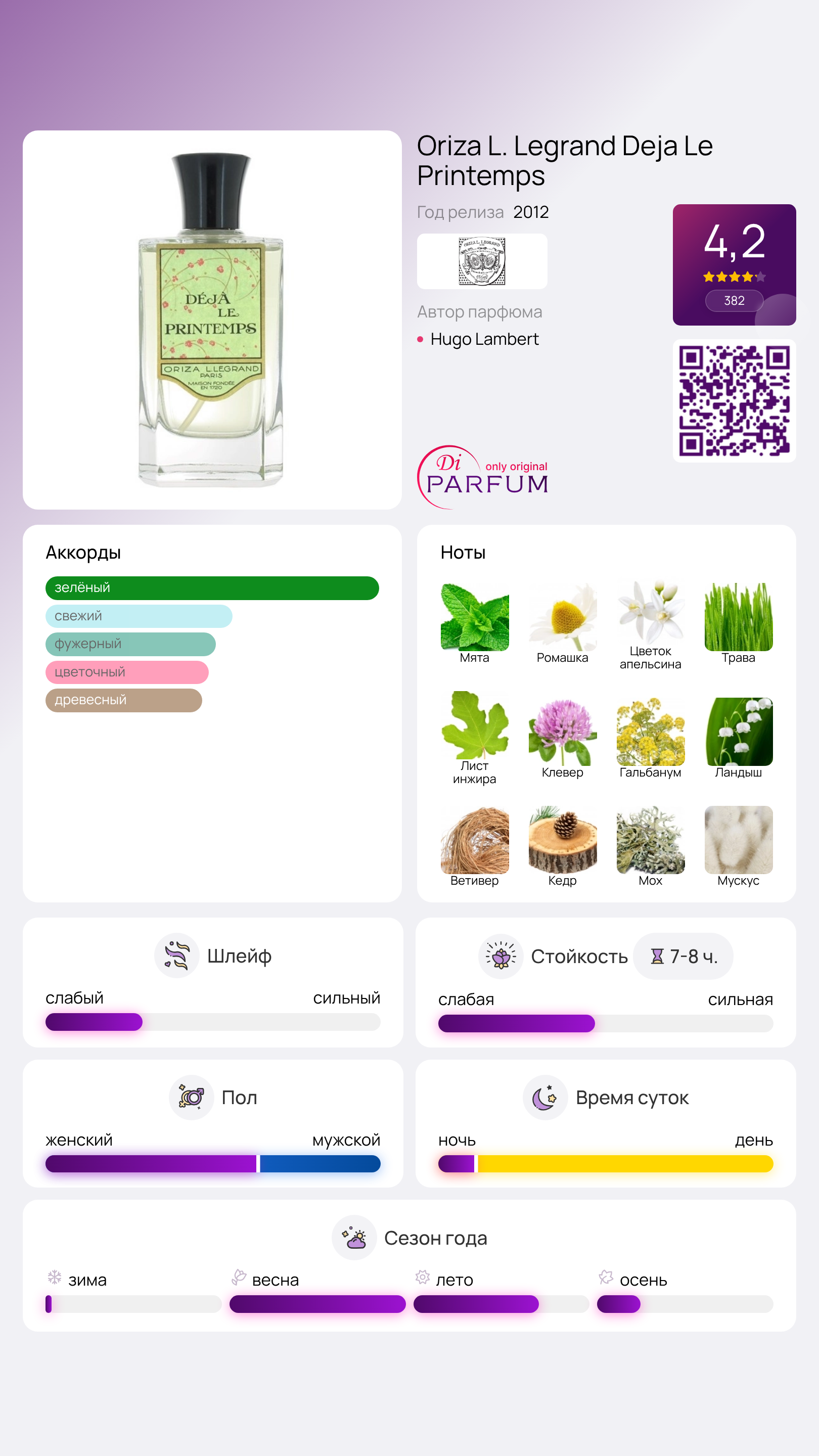 База аромата дополняется хвойными акцентами кедра, травянистой влажностью ветивера и лесной свежестью мха дуба, которые раскрываются на мускусном фоне. Oriza L. Legrand Deja Le Printemps способен создать приподнятое настроение, увеличить уровень энергии и пробудить желания, настроив на яркие и многообразные мечты.