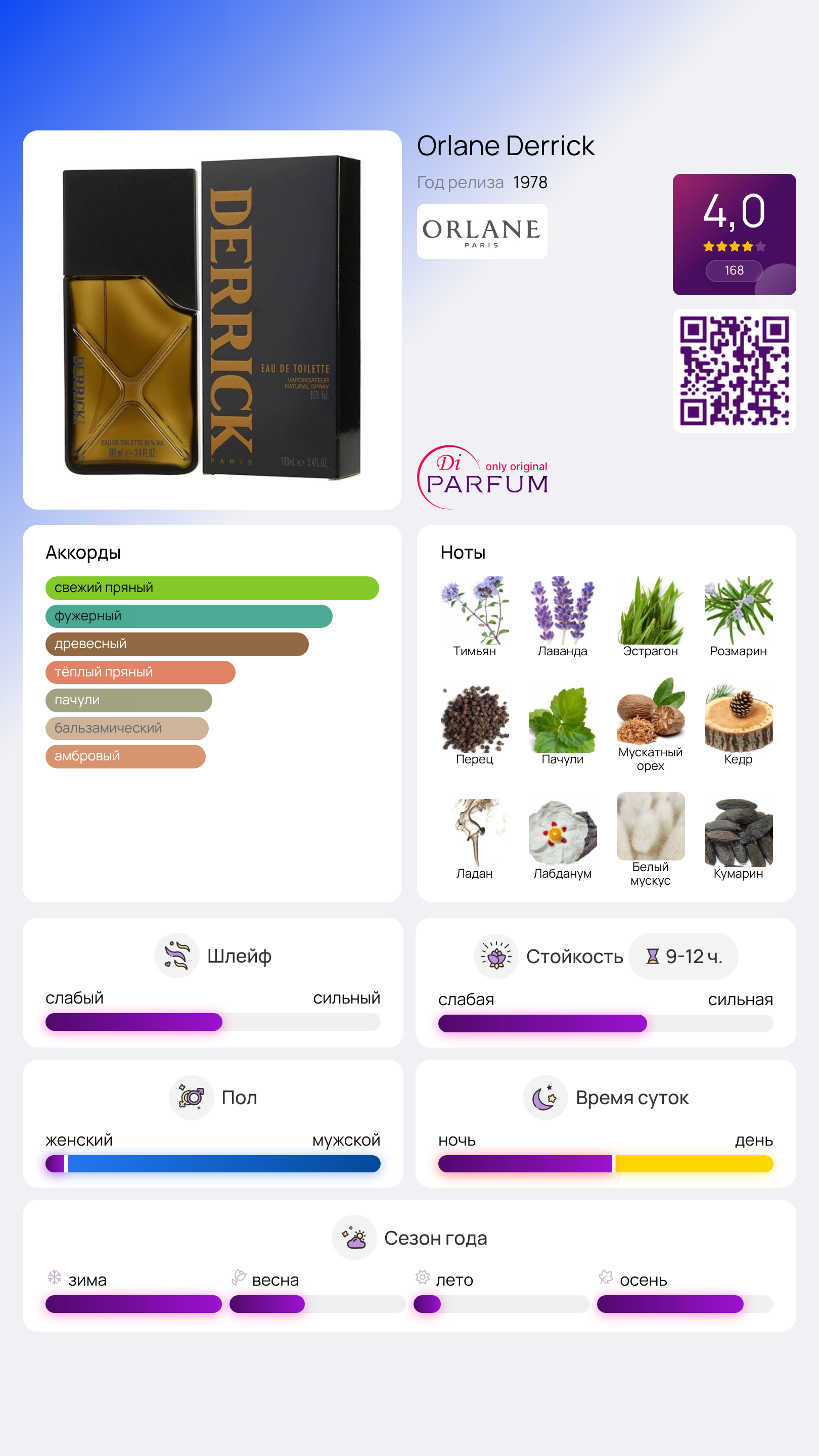 Композиция, созданная по всем канонам искусства парфюмерии, раскрывает всю свою великолепие — в начале ощущается мощный поток лаванды, мягкая сладость свежего розмарина, терпкие ноты тимьяна и взрывной аромат растертого тархуна. Сердце аромата сочетает древесные и цветочные ноты с легким оттенком специй. Хвойный свежий аромат кедра и сосны придает благородную сдержанность, дополняется нежностью жасмина и сливочным мускатом, а пряно-свежие герань и пачули усиливаются остротой черного перца. Завершающие аккорды Orlane Derrick наполнены теплотой ладана, ванильно-камфорным кумарином и белым мускусом, создавая поистине незабываемый след.