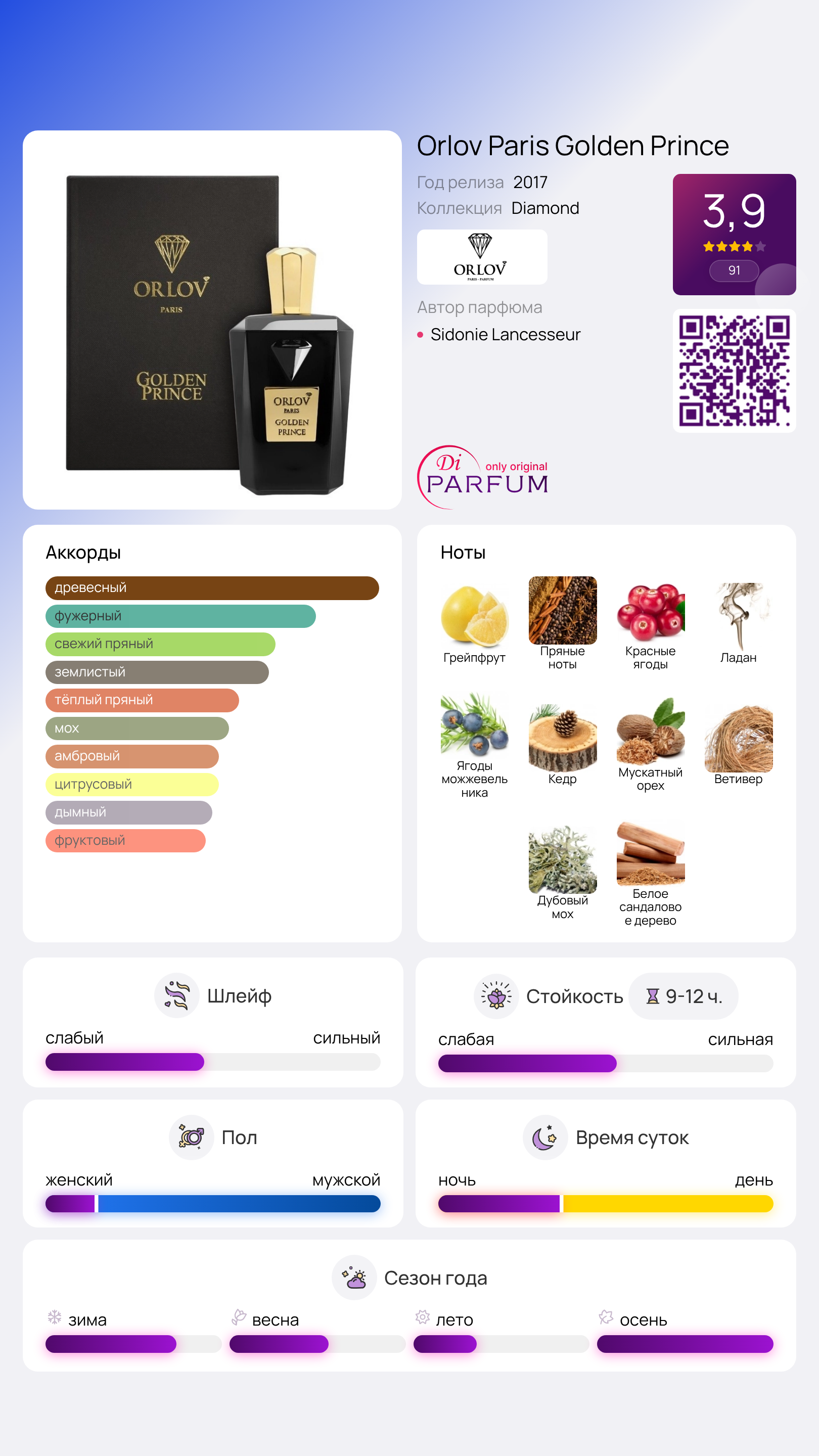 Парфюм Orlov Paris Golden Prince, обладающий благородным древесно-пряным характером, ориентирован на успешного человека своего времени, который привлекает внимание женщин и вызывает уважение у мужчин. Этот аромат посвящен коричневому алмазу, который стал украшением выставки в Париже в 1937 году. Он олицетворяет ключевые качества «Золотого принца»: силу духа, утонченность и пылкую страсть.
