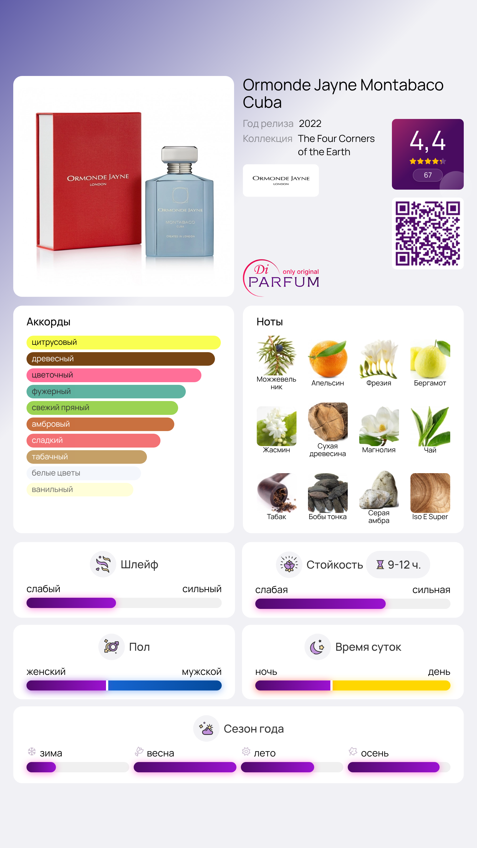 Шлейф композиции включает в себя ванильный абсолют, дымные бобы тонка, солоноватую амбру, темную замшу, сливочный сандал и уникальную молекулу iso e super. Montabaco Cuba от Ormonde Jayne — это выдающийся и тонкий аромат, который трудно не заметить. Он будто приглашает владельца, будь то мужчина или женщина, в мир загадочных и пленительных приключений.