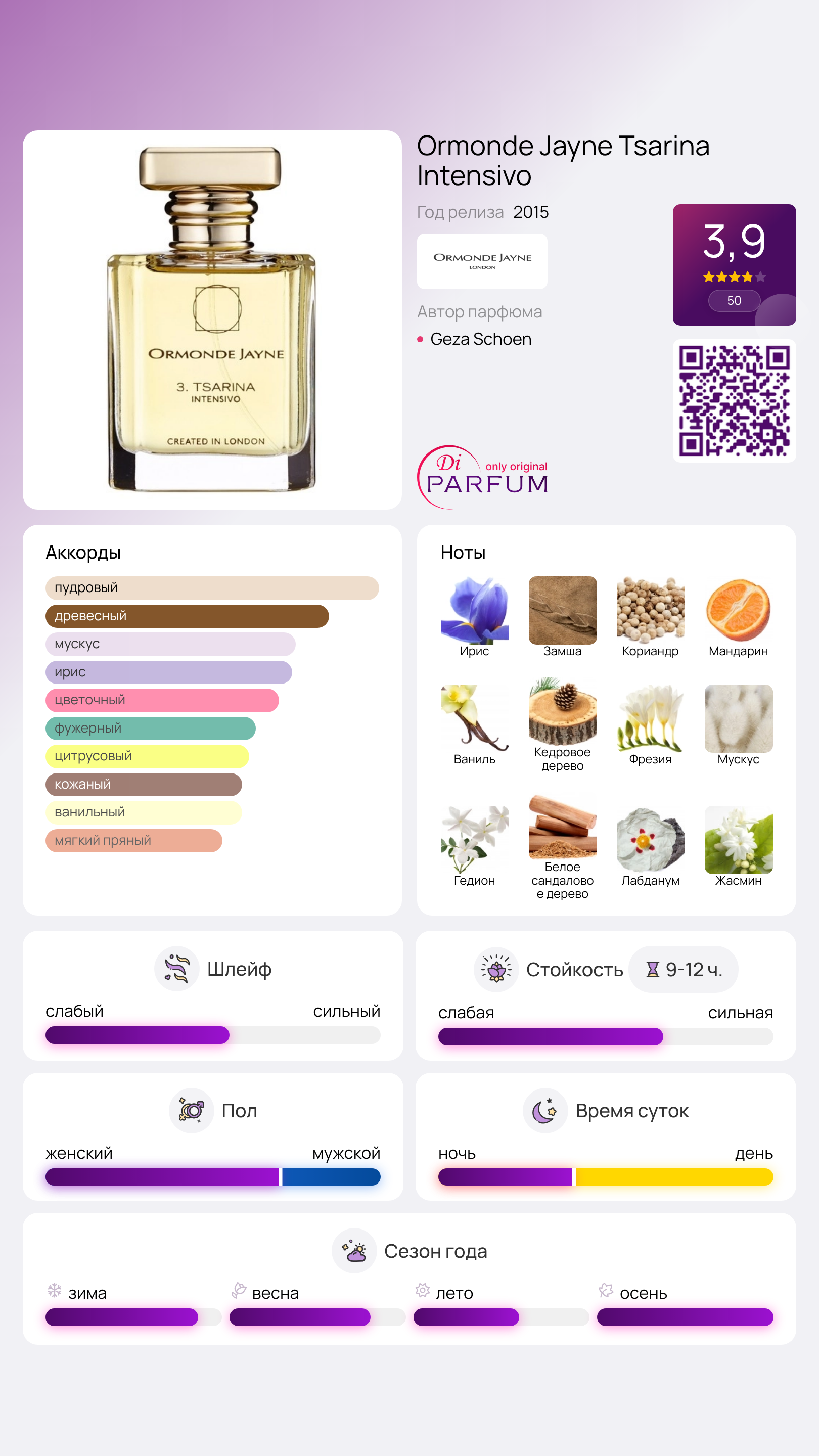 Tsarina Intensivo – это унисекс аромат от Ormonde Jayne, который является развитием известной версии Tsarina, полюбившейся многим парфюмерным энтузиастам. Этот парфюм отличается высокой стойкостью и насыщенностью, олицетворяя истинную царственную роскошь, неукротимую страсть и великолепие Востока.