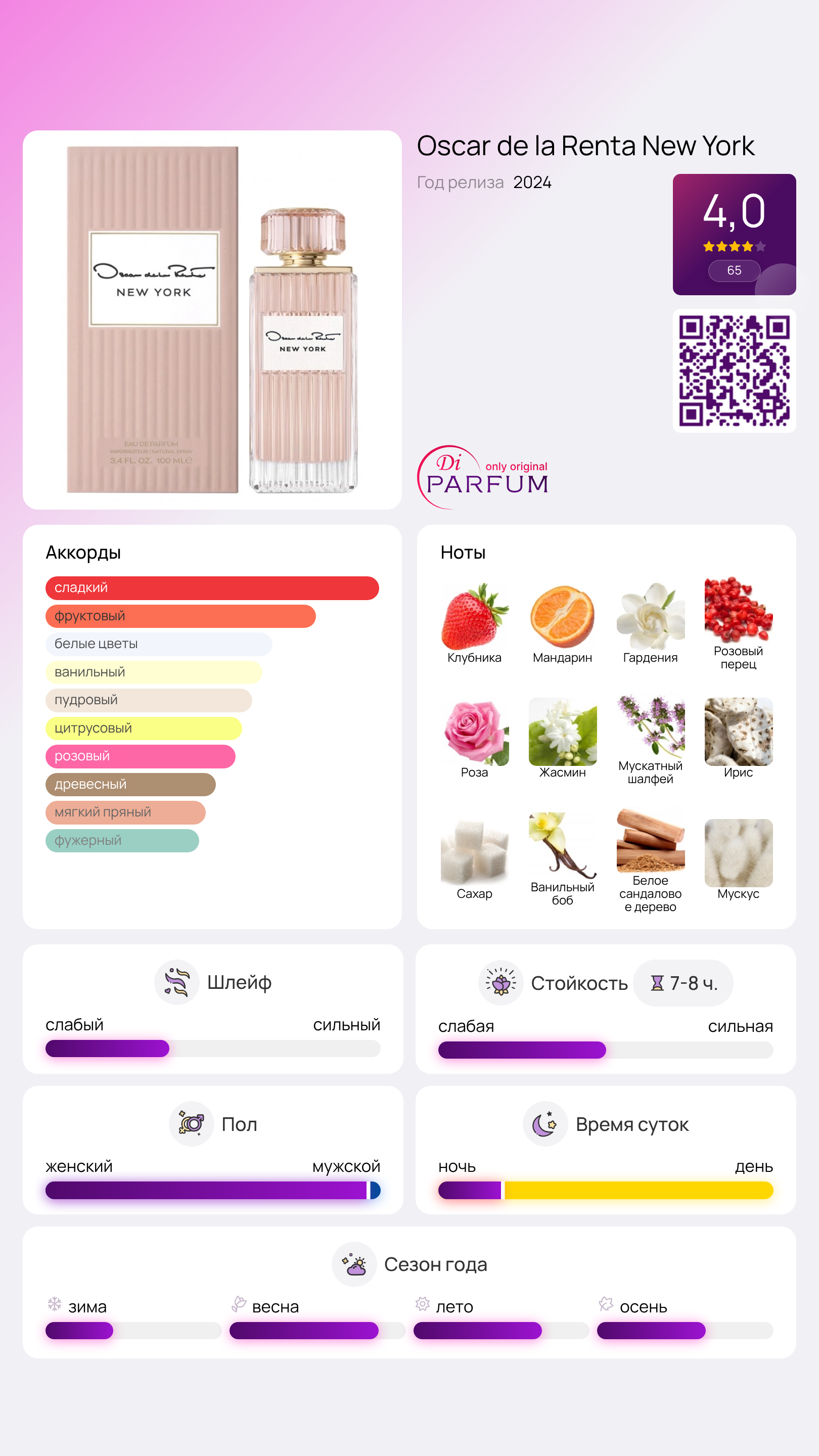 Основные ноты: клубника, танжерин, розовый перец, гардения; средние ноты: роза, жасмин, мускатный шалфей, корень ириса; базовые ноты: сандал, сахарные кристаллы, ваниль, мускус. Погрузитесь в волшебство и очарование одного из самых знаменитых городов мира с New York от Oscar de la Renta – идеальным выбором для женщин, которые ценят стиль и изысканность.