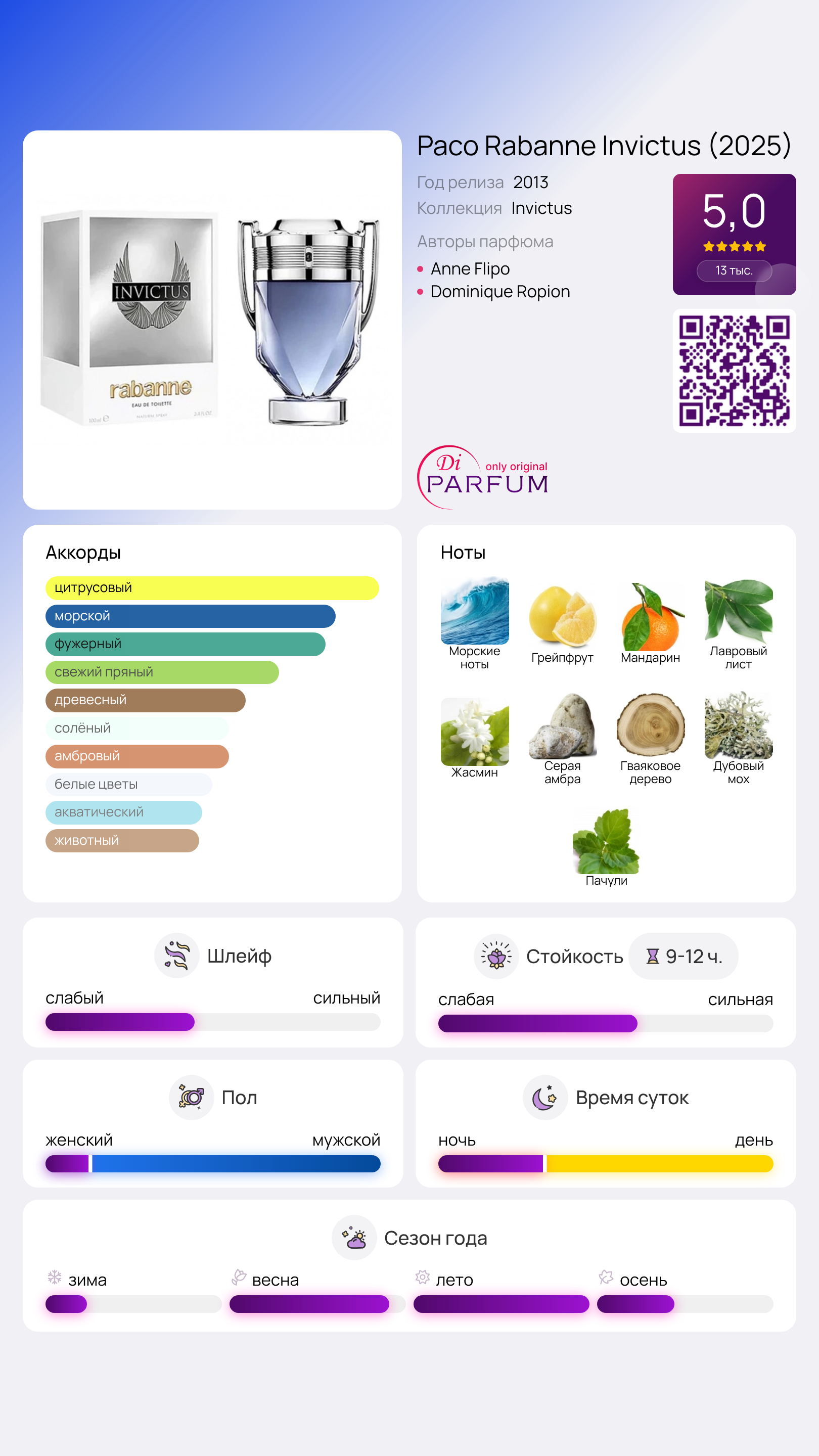 Invictus от Paco Rabanne — это древесно-водяной аромат для мужчин, который был запущен в 2013 году. Создание аромата стало результатом работы таких парфюмеров, как Вероник Ниберг, Анн Флиппо, Оливье Полж и Доминик Ропион. В верхних нотах вы почувствуете свежесть морских аккордов, грейпфрута и мандарина, а сердцевина раскрывается ароматами лаврового листа и жасмина. Завершают композицию базовые ноты амбра, гуаяк, дубовый мох и пачули.