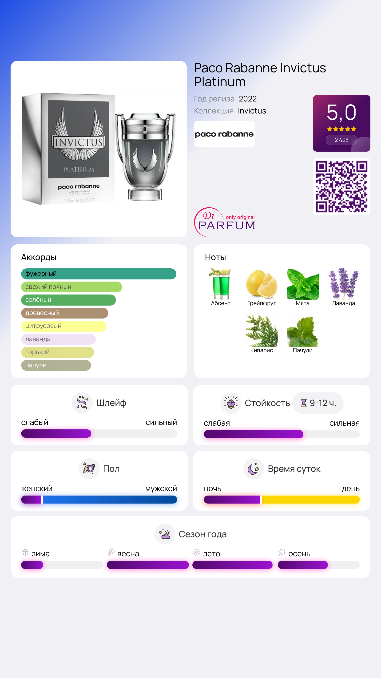 Парфюм Paco Rabanne Invictus Platinum представляет собой интенсивную фужерную древесную композицию, которая наполняет свежестью и поднимает уровень энергии. В этой платиновой смеси собраны сила и мощь в их самой чистой форме. Новый "кубок победителя" от знаменитого испанского бренда станет идеальным символом награды для выбранных.