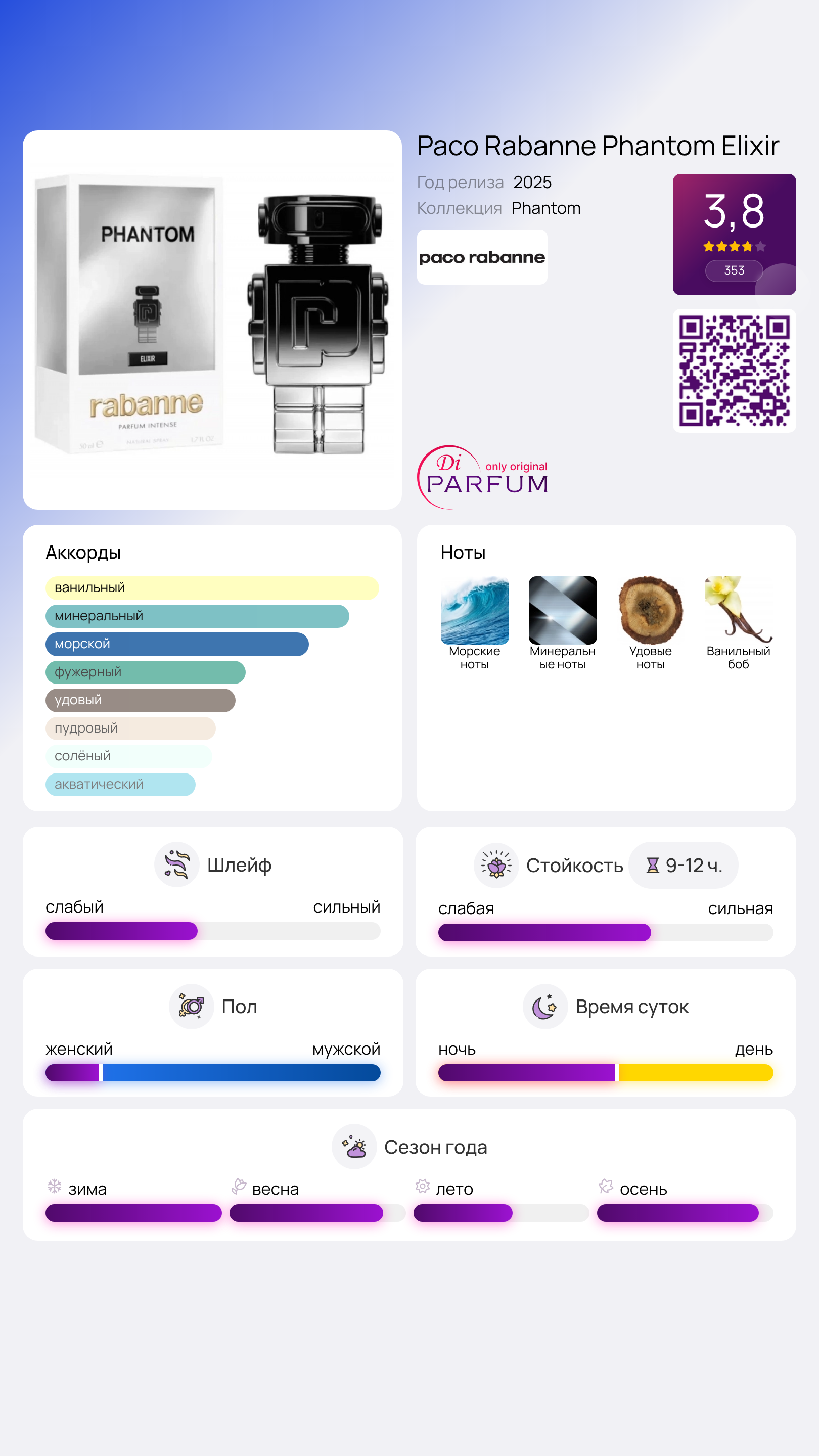 В завершении композиции звучит ваниль, создающая теплое и волнующее послевкусие. Шлейф Paco Rabanne Phantom Elixir остается на коже до самого рассвета, подчеркивая, что истинная мужественность не может быть однозначной.