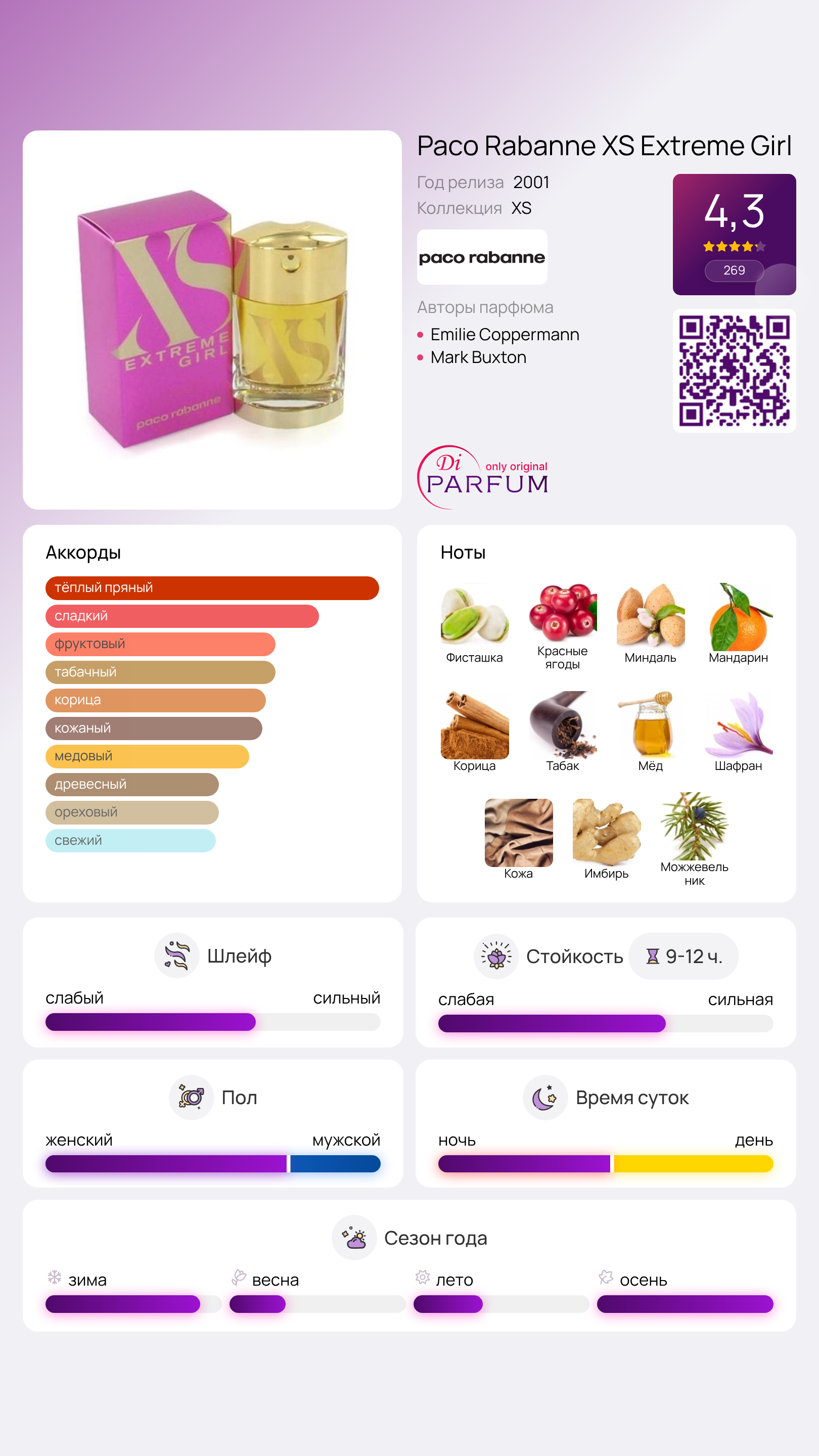 Добавив немного мандарина и красные ягоды, мы получим яркое сочетание. Корица и шафран привнесут в композицию пряную нотку, а сладость и легкость дополнит золотистый мед. Древесные акценты секвойи и красного кедра придадут аромату завершенность.