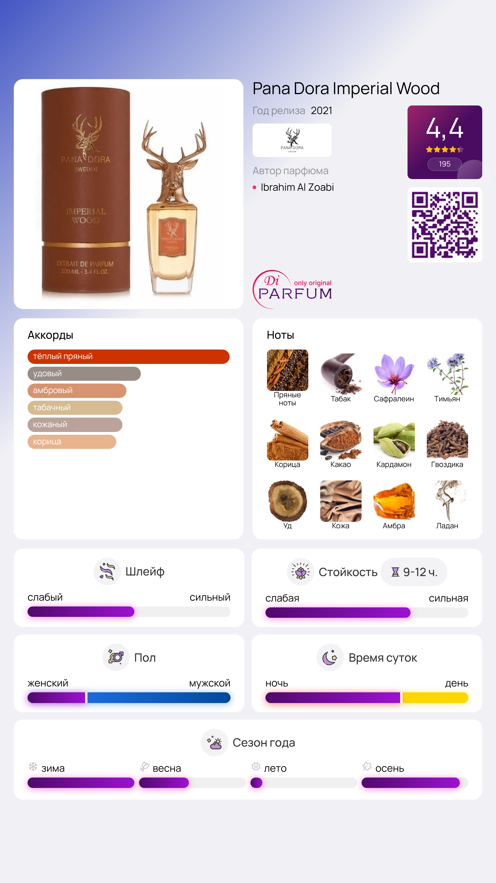 Имперская древесина от Pana Dora воссоздает атмосферу волшебной эпохи, насыщенную чувственной энергетикой, что делает ее идеальным аксессуаром как для мужчин, так и для женщин. Этот парфюм был выпущен известным шведским брендом в 2021 году, а стильный флакон с золотистой головкой оленя станет прекрасным подарком.