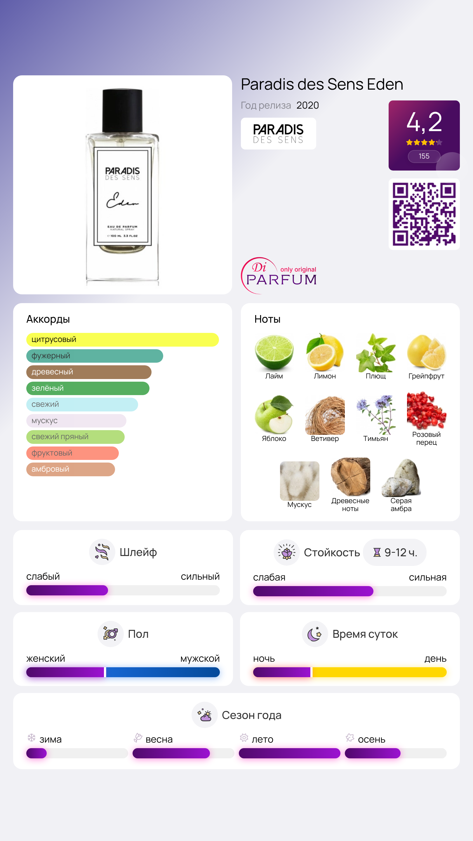 Аромат наполняет воздух сладким запахом спелого яблока, а животная серая амбра с легким мускусом добавляют глубину шлейфа. На фоне слышатся многогранные древесные аккорды, создавая атмосферу лесного покоя. Энергия композиции Eden от Paradis des Sens окутывает своего обладателя, как мужчину, так и женщину, придавая им соблазн и искушение.
