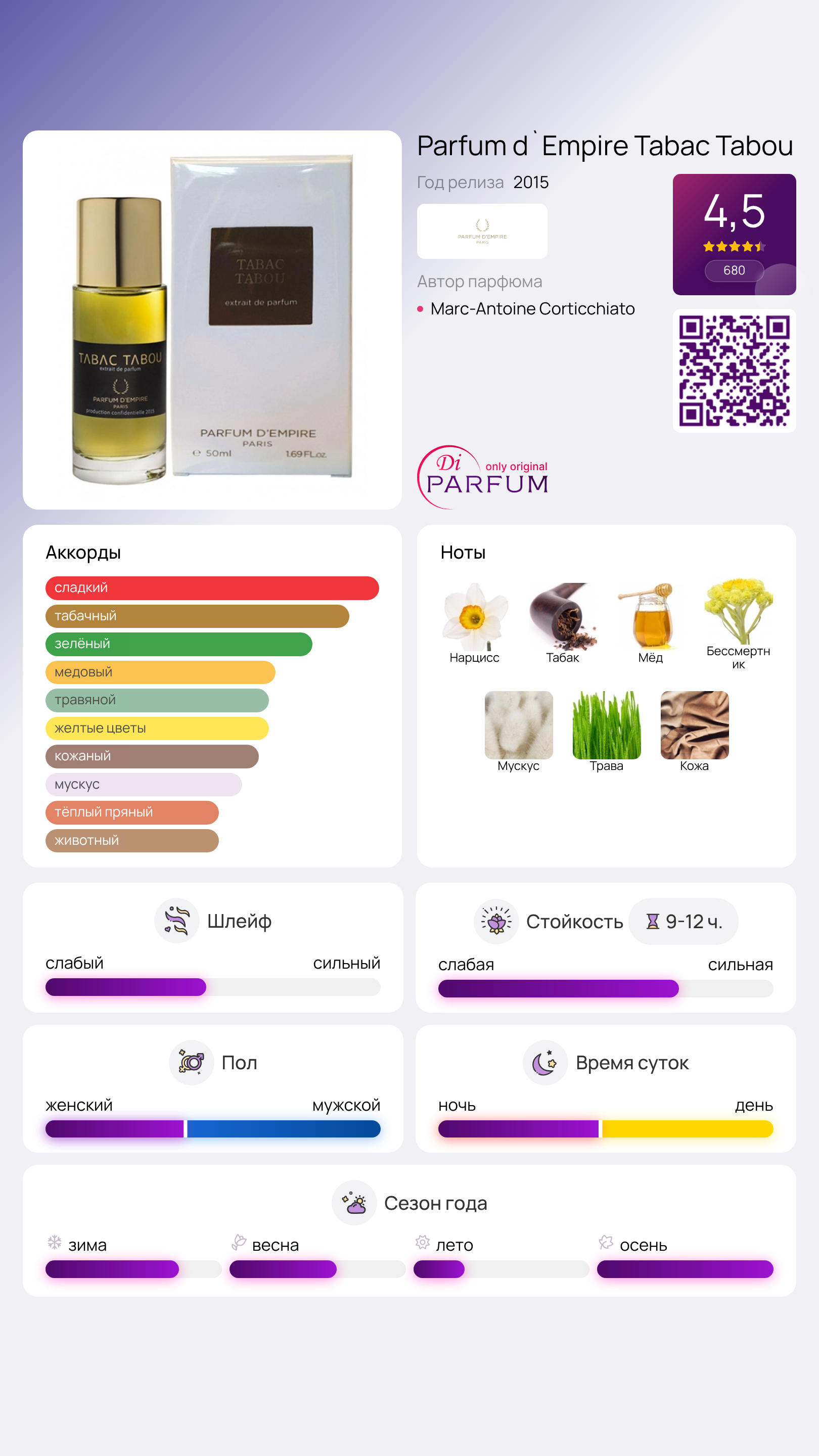 Аромат Parfum d'Empire Tabac Tabou представляет собой восточный фужерный парфюм, который глубоко интерпретирует тему натурального табака. В культуре индейцев Северной Америки табак считается священным растением, а его использование в курении имеет ритуальный характер, связывая человека с историей традиций. Этот парфюм объединяет атмосферу уютного курительного клуба с ощущением похода на природу.