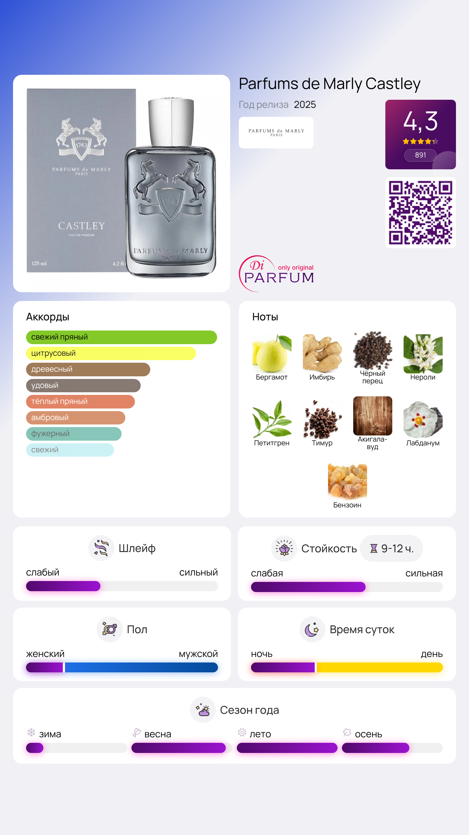 Ароматическая композиция под названием Castley черпает вдохновение из отважных исследователей и первопроходцев, которые способствовали открытию новых земель, а также поиску редких материалов и драгоценных специй. Дух свободы и стремления к творчеству современным мужчинам передает этот цитрусово-восточный аромат от бренда Parfums de Marly, который был представлен в 2025 году.