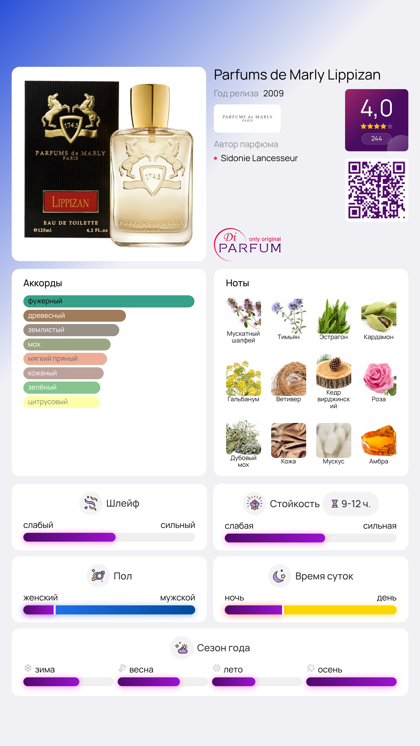 Парфюм Lippizan от Parfums de Marly, созданный парфюмером Сидони Лансессюр в 2012 году, представляет собой мужской древесно-шипровый аромат. Его композиция отличается монументальностью и щедростью, что отлично отражает стиль оформления флакона.