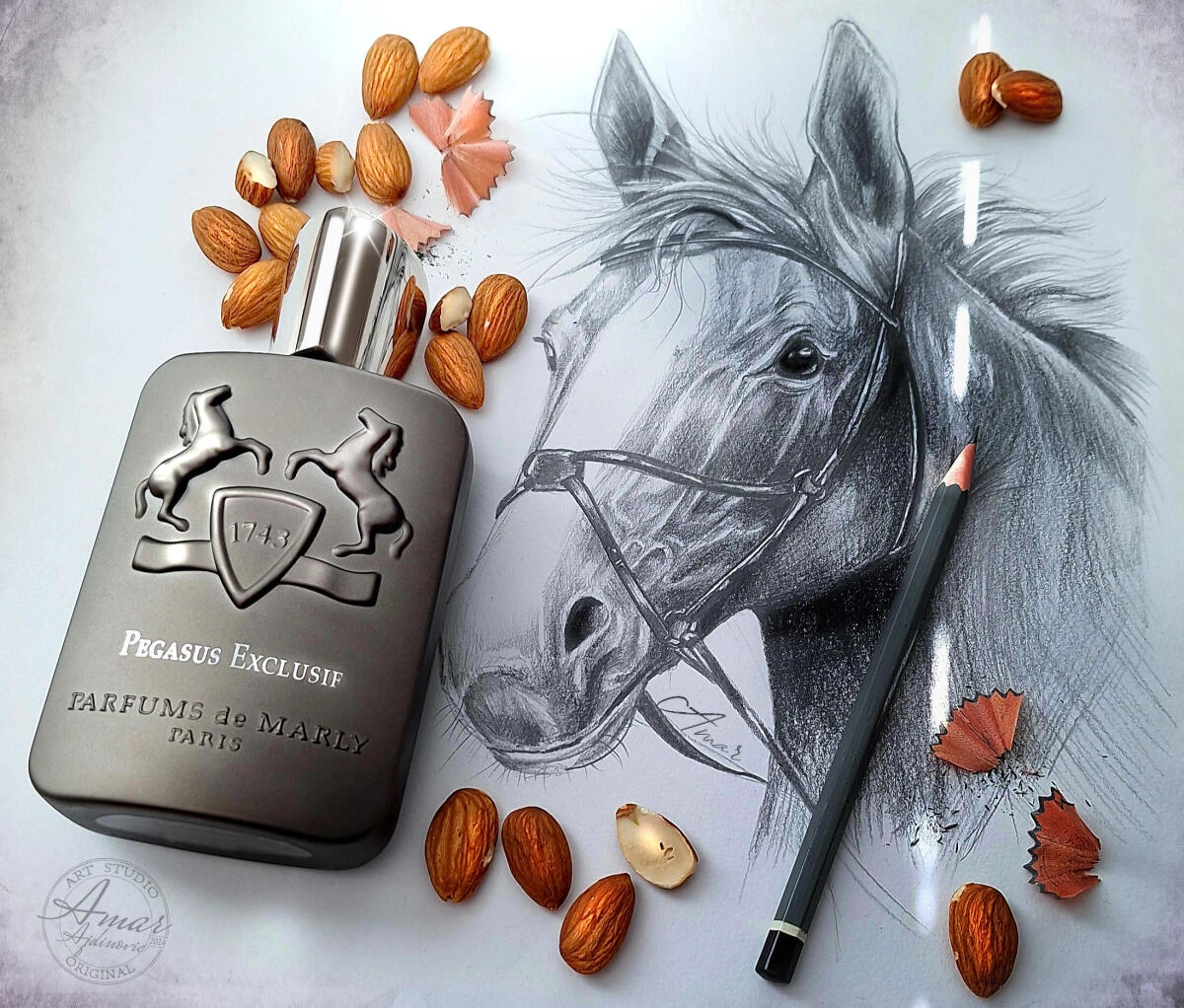 Аромат открывается изысканным сочетанием розового перца и вишнёвых нот гелиотропа, дополненных свежестью кардамона. Для создания яркости, верхние ноты дополнили пряными и цитрусовыми листьями бергамота, которые ведут к сердцу композиции. В сердце аромата герань находит гармонию между прохладной лавандой и сочным жасмином, тогда как аккуратно сбалансированные ноты миндаля добавляют необходимую сложность. Базу Parfums de Marly Pegasus Exclusif составляют древесно-восточные аккорды, где гуаяковое древесное облако, драгоценное удовое дерево и благородный сандал создают атмосферу аристократии, сочетающую в себе горящий темперамент и утончённые манеры с нежным блеском ванили и серебристым звоном амбры.