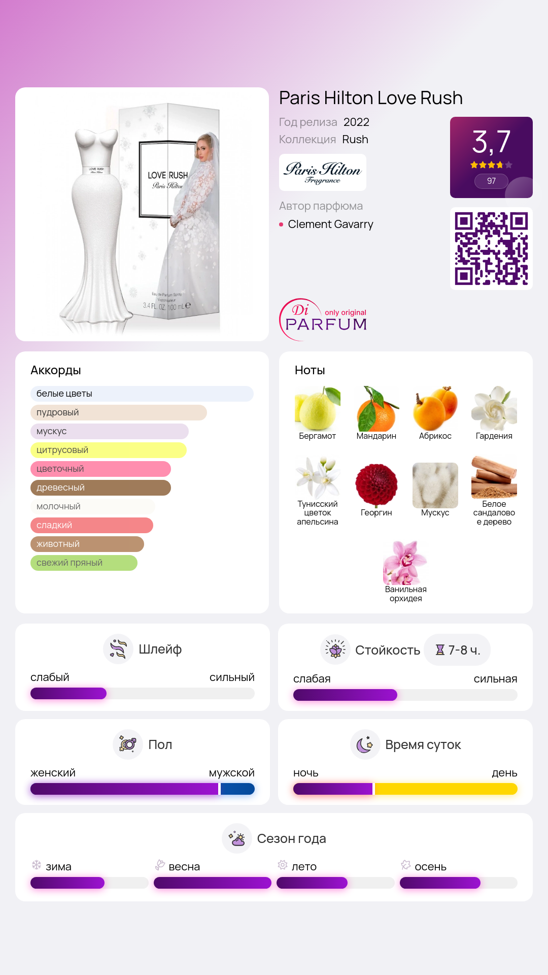 Завершающие ноты включают теплый мускус, сливочно-древесный сандал и нежную ванильную орхидею, которые сплетаются в чувственный и притягательный шлейф. Paris Hilton Love Rush обладает утонченным, красивым и манящим звучанием, делая его стильным дополнением как для свадебного наряда, так и для любого торжественного образа элегантной женщины.